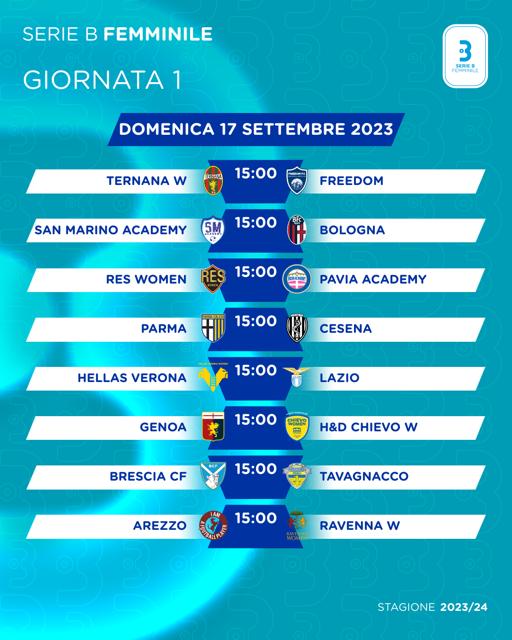 Domenica prenderà il via la nuova stagione della Serie B Femminile. Sedici squadre ai nastri di partenza e 30 giornate per decidere la squadra promossa in Serie A, quella che disputerà lo spareggio (contro la penultima del massimo campionato) e le tre retrocesse in C. Le otto gare della prima giornata si giocheranno in contemporanea, calcio d’inizio alle ore 15: i riflettori saranno puntati sul derby Parma-Cesena e sui debutti di Lazio e Ternana, apparse in grande forma nelle sfide di Coppa Italia disputate una settimana fa.