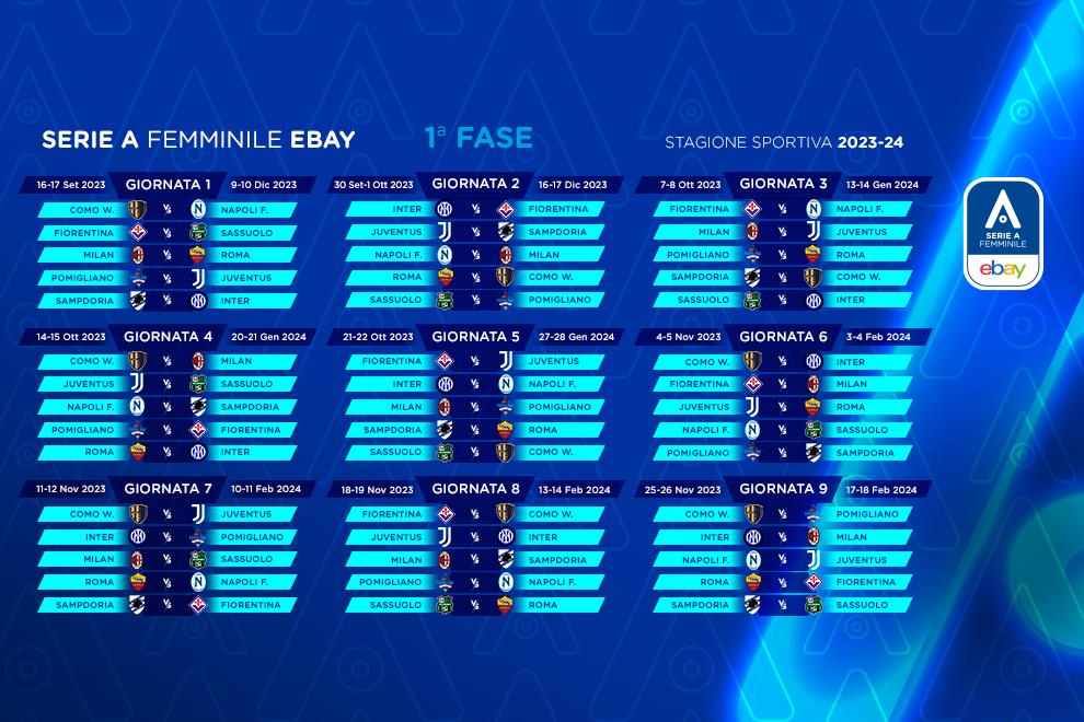 È la sfida tra Milan e Roma il match clou che aprirà la Serie A eBay 2023-24, il secondo campionato di Serie A Femminile dall'introduzione del professionismo. Le campionesse d'Italia ripartiranno quindi dalla trasferta sul campo delle rossonere. Fuori casa anche l'esordio della Juventus, che aveva conquistato i precedenti cinque campionati: la squadra di Montemurro sarà di scena a Pomigliano, con Como Women-Napoli Femminile, Fiorentina-Sassuolo e Sampdoria-Inter a completare il quadro della prima giornata prevista per il weekend tra sabato 16 e domenica 17 settembre (gli orari e giorni di gara saranno resi noti successivamente).