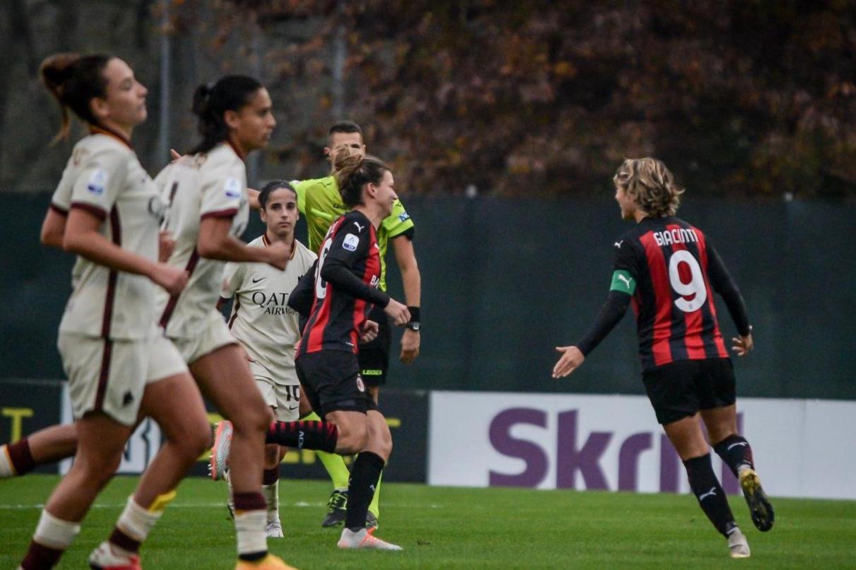 Il Milan soffre contro la Roma ma fa suo il big match con un calcio di rigore trasformato da Giacinti e rimane in scia alla Juventus, prima in classifica a +3. Nella sfida del "Vismara", partita di cartello dell’8a giornata della Serie A TIMVISION 2020-21, partono più aggressive le ospiti, ma le occasioni create dalle giocate di Andressa e Giugliano mancano di precisione e non vanno a buon fine. Dalla parte opposta sono Grimshaw e Giacinti a prendersi più spazi in attacco, ma nemmeno le offensive rossonere incidono sul risultato nei primi 45'. Al 55' invece si verifica l'episodio che cambia l’equilibrio della gara: il portiere delle capitoline Baldi viene espulso per aver toccato due volte il pallone su rimessa dal fondo impedendo a Giacinti di ribadire in rete (al suo posto tra i pali subentra Pipitone). La punizione a distanza ravvicinata si impenna sopra la traversa ma le padrone di casa avanzano e intensificano con il passare dei minuti la manovra offensiva, finché al 70’ Dowie atterrata fallosamente in area guadagna il penalty. Giacinti dal dischetto non sbaglia e mette la firma sul vantaggio rossonero oltre che sulla settima marcatura nel campionato in corso. Le dieci di Bavagnoli reagiscono e nonostante l'inferiorità numerica trovano spazi nella metà campo avversaria, ma Giugliano si divora l'occasione dell'1-1 e al triplice fischio i tre punti vanno alla formazione di Ganz.