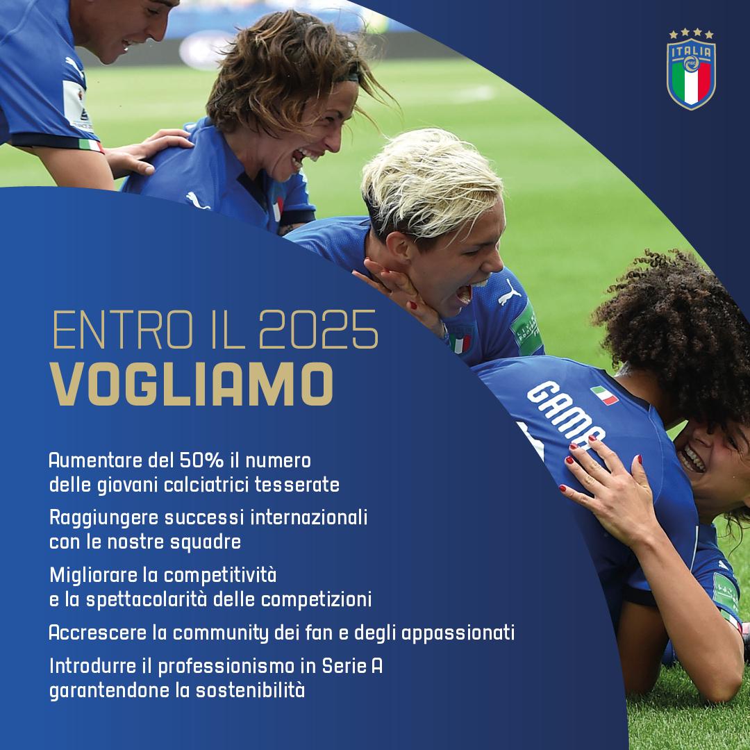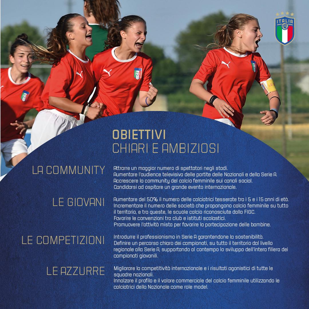 Nel prossimo quadriennio l’intenzione è di aumentare del 50% il numero delle giovani calciatrici tesserate, raggiungere successi internazionali con le sette squadre nazionali, migliorare la competitività e lo spettacolo delle competizioni, accrescere la fan base e, a partire dalla stagione sportiva 2022/23, introdurre il professionismo nella Serie A, garantendo al tempo stesso la sostenibilità del campionato. "La FIGC - ha aggiunto il presidente federale - ha adottato per prima questo storico provvedimento e stiamo lavorando per farci trovare pronti entro la stagione sportiva 2022/23".