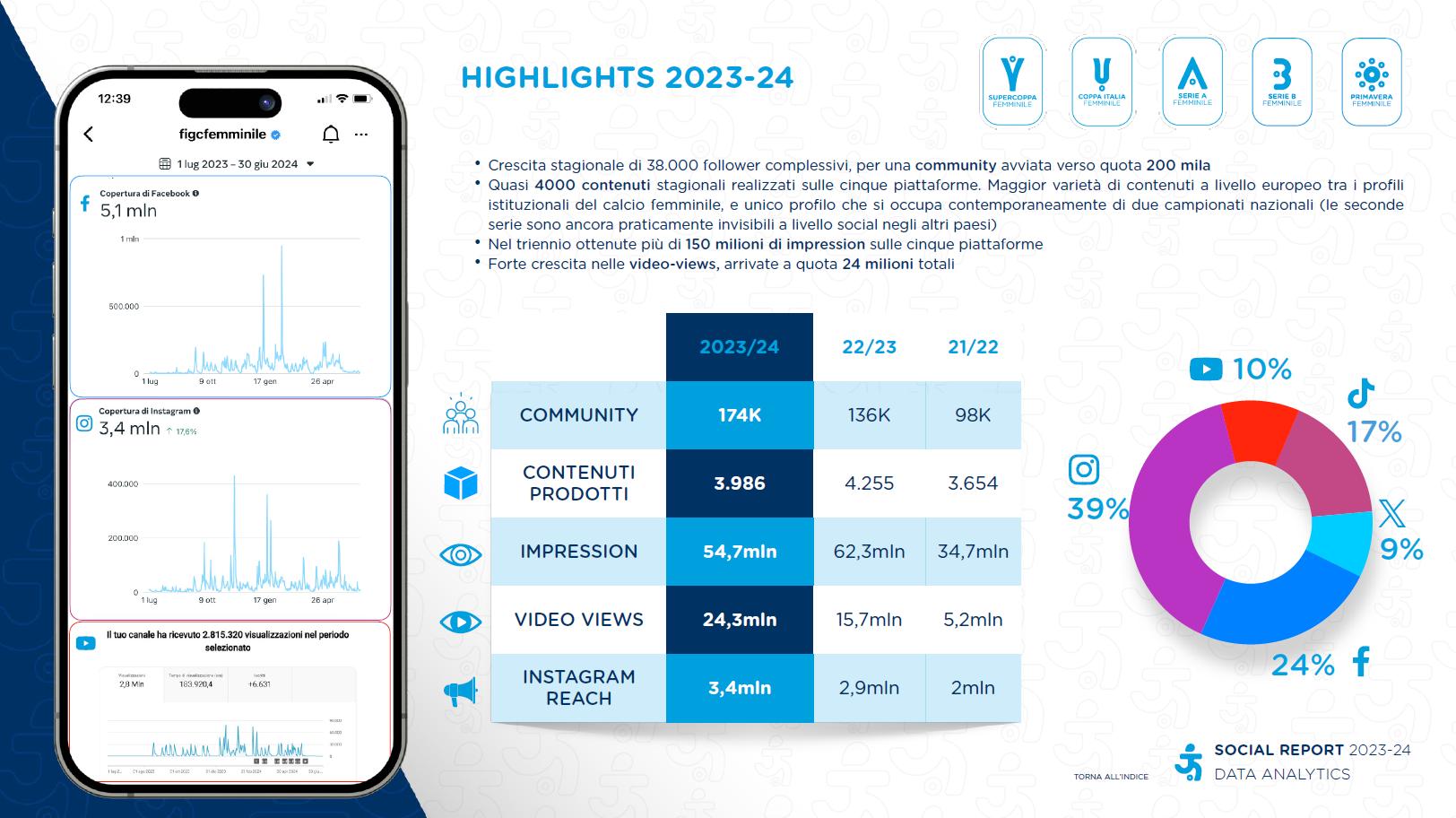 All'interno delle 27 pagine del documento consultabili c'è l'analisi di una stagione di attività delle Divisioni Serie A Femminile Professionistica e Serie B Femminile. Sono stati complessivamente oltre 3.986 i contenuti prodotti e disponibili sui vari canali (Facebook, X, Instagram, TikTok e YouTube), per un totale di 24,3 milioni di visualizzazioni e 54,7 milioni di impression.