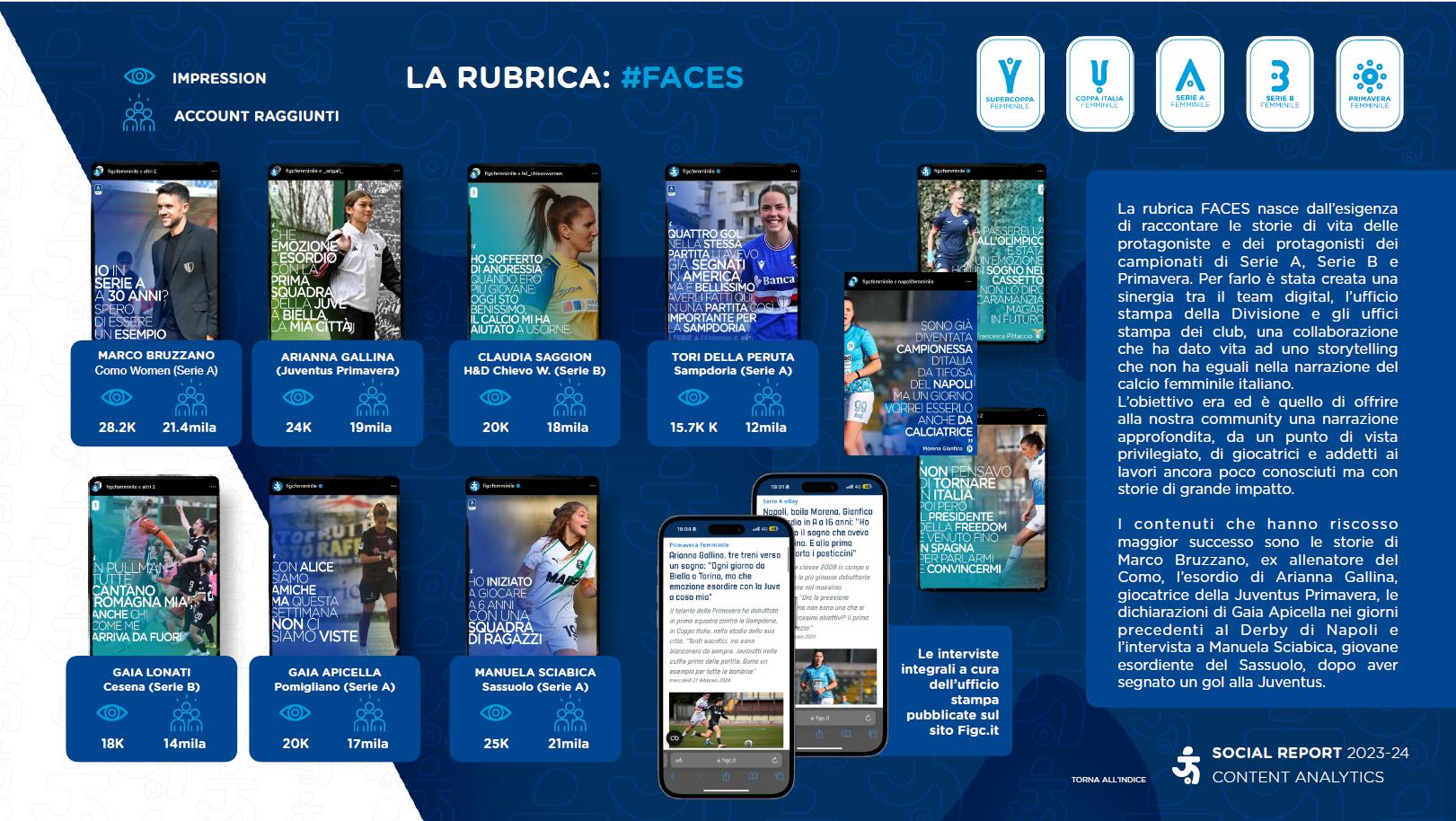Foto, video, ma non solo: la stagione 2023-24 è stata quella del lancio di FACES, la rubrica confermata anche per il 2024-25 realizzata in sinergia tra il team digital e l'ufficio comunicazione della FIGC e che ha raccontato con una nuova prospettiva e crossmediale (sito e social) le protagoniste dei campionati di Serie A, Serie B e Primavera. Racconti di vita, prima che di calcio giocato.
