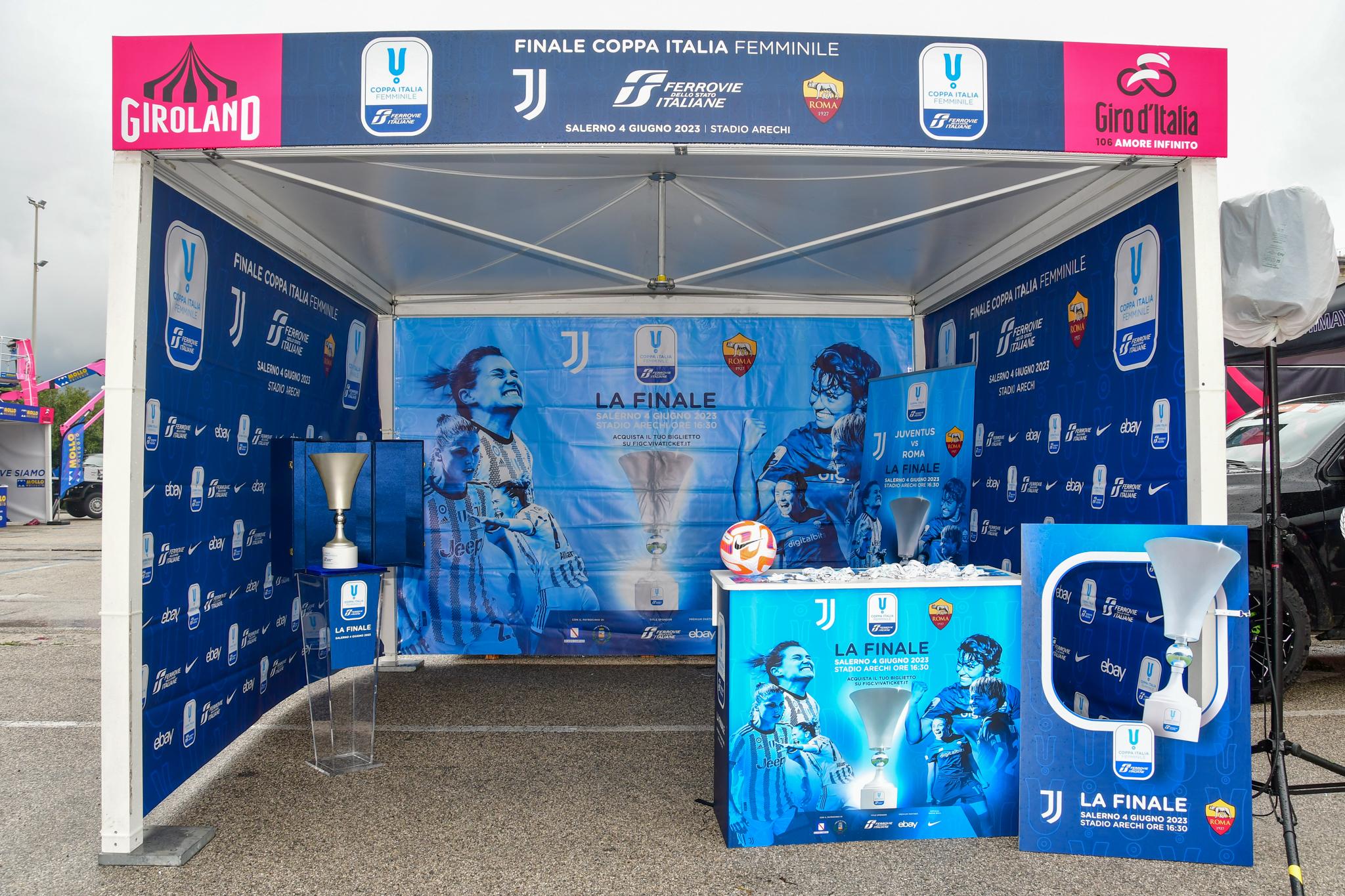La Coppa Italia Ferrovie dello Stato Italiane e la Corsa Rosa, un binomio che ha dato il via alla lunga volata verso la finale tra Juventus e Roma in programma domenica 4 giugno alle 16.30 allo Stadio Arechi di Salerno. Il trofeo che verrà messo in palio nella sfida tra bianconere e giallorosse è stato esposto oggi nell’Open Village della quinta tappa del Giro d’Italia, terminata sul lungomare della città campana.