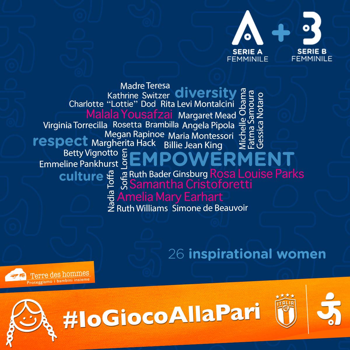 Per dare ancora più visibilità a questa ‘orange revolution’, con il suo focus su empowerment e talento, la Divisione Calcio Femminile - proseguendo con il suo piano di Responsabilità Sociale - ha chiesto alle calciatrici di ciascun club di indicare la propria personalità femminile di riferimento. Dall’astronauta Samantha Cristoforetti all’attivista statunitense Rosa Parks, da Maria Montessori a Margherita Hack passando per la figlia del presidente del Pomigliano, la stilista Angela Pipola, alla cui memoria è dedicata la squadra femminile. Un elenco simbolico che comprende aviatrici, scienziate, missionarie, intellettuali, attrici, artiste e atlete, ma anche persone comuni che hanno affrontato violenze e pregiudizi, uscendone in maniera vincente.