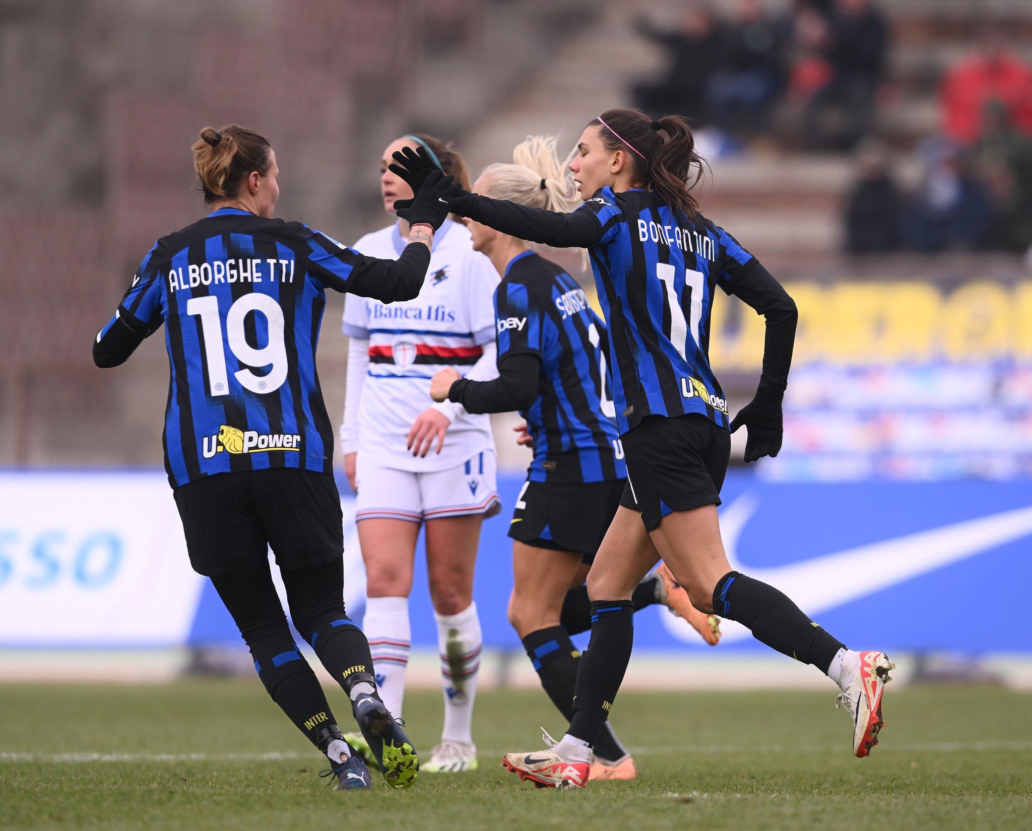 Si chiude invece con un pareggio l’anticipo delle 12.30 all’Arena Civica tra Inter e Sampdoria. Le nerazzurre di Guarino vanno sotto di un gol dopo appena sei minuti: punizione di Schatzer perfetta dalla trequarti, che vale non soltanto il vantaggio delle ospiti ma anche il suo primo gol in assoluto nel massimo campionato. La classe 2005 è inoltre diventata la più giovane giocatrice con una rete su punizione diretta nelle ultime quattro edizioni del torneo. Dopo lo svantaggio arriva però la reazione delle padrone di casa, che nonostante sfiorino l’1-1 in diverse occasioni (le più limpide quelle di Karchouni, Cambiaghi, Bowen e Sonstevold) si scontrano con una monumentale Tampieri tra i pali – sei le parate dell’estremo difensore effettuate soltanto nel primo tempo. A inizio ripresa la formazione di Mango va vicina al raddoppio con una bella girata di testa di Sondergaard, ma questa volta è Cetinja a non farsi sorprendere. L’Inter però, scampato il pericolo, torna ad attaccare con più determinazione, e alla fine il conto lo pareggia grazie alla rete di Bonfantini (subentrata a Polli proprio al fischio d’inizio del secondo tempo), che dopo una serie di rimpalli sul corner di Alborghetti riesce a trovare la deviazione vincente sotto porta.