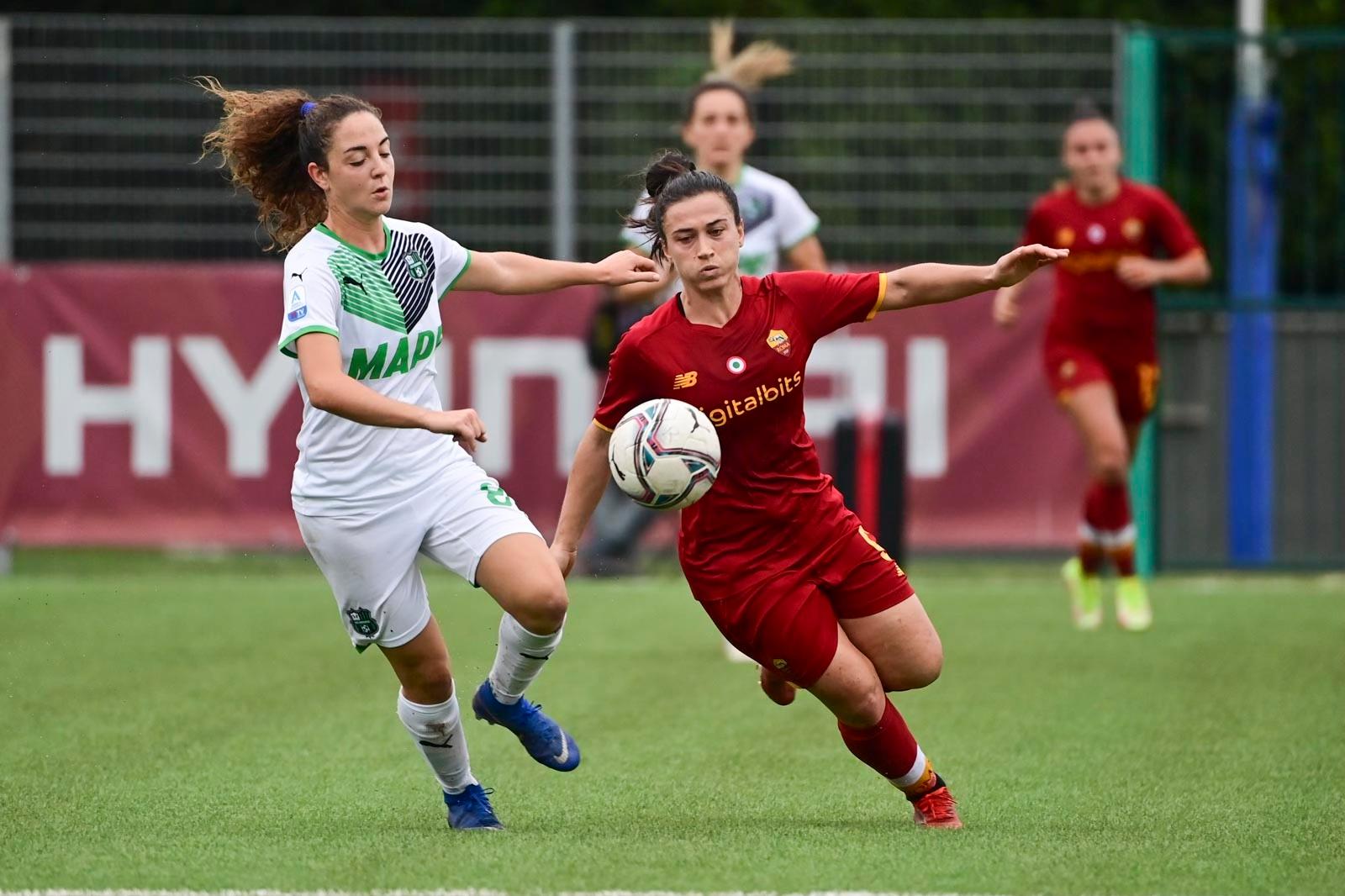 Si ferma a Roma, dopo sei vittorie, la marcia del Sassuolo in campionato. Le neroverdi, che prima di questo turno avevano tenuto il passo della Juventus campione d’Italia – ora prima in solitaria a punteggio pieno – perdono 2-0 sul campo delle giallorosse di Spugna, che si rialzano dopo il ko con l’Inter (recupero della 4ª giornata disputatosi lo corso 16 ottobre) e centrano il quarto successo nella competizione in corso. Al campo "Di Bartolomei" di Trigoria le due formazioni non brillano in avvio per occasioni create, ma al 23’ le padrone di casa si portano avanti: calcio d'angolo di Andressa e stacco vincente dell'ex Pirone, che di testa trova l'1-0 e mette a referto la seconda rete contro le emiliane in Serie A (la prima nel febbraio 2019 con la maglia del Chievo Verona Valpo). Alla mezzora Bartoli sfiora il raddoppio, ma la sua incornata a due passi dalla porta si spegne sull'esterno della rete. Il Sassuolo fatica a trovare spazi e ad alzare il ritmo, Cantore è la più pericolosa tra le emiliane ma la difesa avversaria fa buona guardia e all'intervallo il parziale non cambia. A inizio ripresa invece si concretizza il raddoppio: sugli sviluppi di una punizione di Glionna è ancora Pirone a farsi trovare pronta e a battere l'ex compagna Lemey con un tap-in vincente. Totale controllo della gara dopo il 2-0 da parte delle undici di Spugna, che abbassano i ritmi, gestiscono il pallone e al triplice fischio festeggiano i tre punti, contro una squadra che nelle prime sei giornate aveva viaggiato a pieno ritmo con la Juventus.