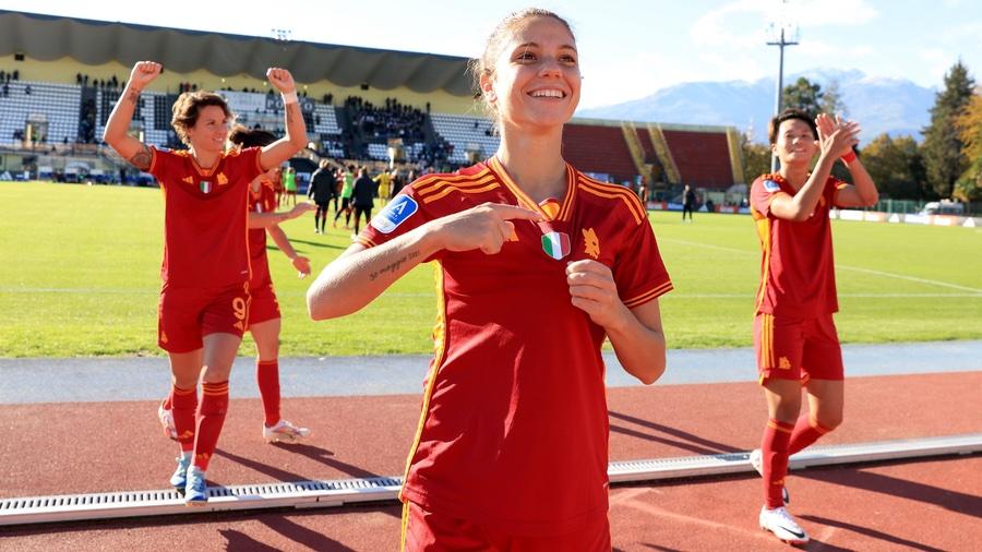 Dopo aver collezionato 15 punti a testa nelle prime cinque giornate di questo campionato, la Roma si aggiudica il big match con la Juventus e si prende la vetta in solitaria, salendo a +3 proprio sulle rivali. Al Pozzo di Biella la gara parte ad altissimo ritmo, ma sono le capitoline ad avere le migliori occasioni nei primi 20’: salvataggio provvidenziale di Peyraud-Magnin sul destro di Viens al 6’ e traversa di Giugliano su punizione dai trenta metri al 23’. È proprio Giugliano però a sbloccare il parziale quattro minuti più tardi: cross di Haavi da destra, respinta di testa di Boattin sulla linea e incornata vincente della centrocampista, chirurgica nello sfruttare un involontario passaggio del terzino bianconero.