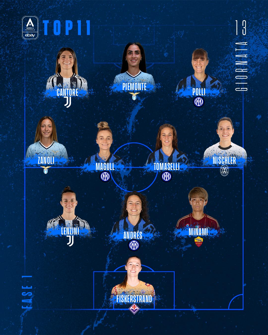 L'ultima Top 11 del 2024 della Serie A Femminile eBay ha un attacco tutto italiano. Protagoniste Elisa Polli (Inter), Martina Piemonte (Lazio) e Sofia Cantore (Juventus), tutte a segno nelle vittorie rispettivamente contro Sassuolo, Milan e Fiorentina. Tutta nerazzurra la coppia di centrali di centrocampo, con Magull e Tomaselli; in difesa c'è Minami, autrice del gol vittoria della Roma a Napoli, mentre tra i pali si conquista un posto Cecilie Fiskerstrand, nonostante la sconfitta della sua Fiorentina contro la Juventus.