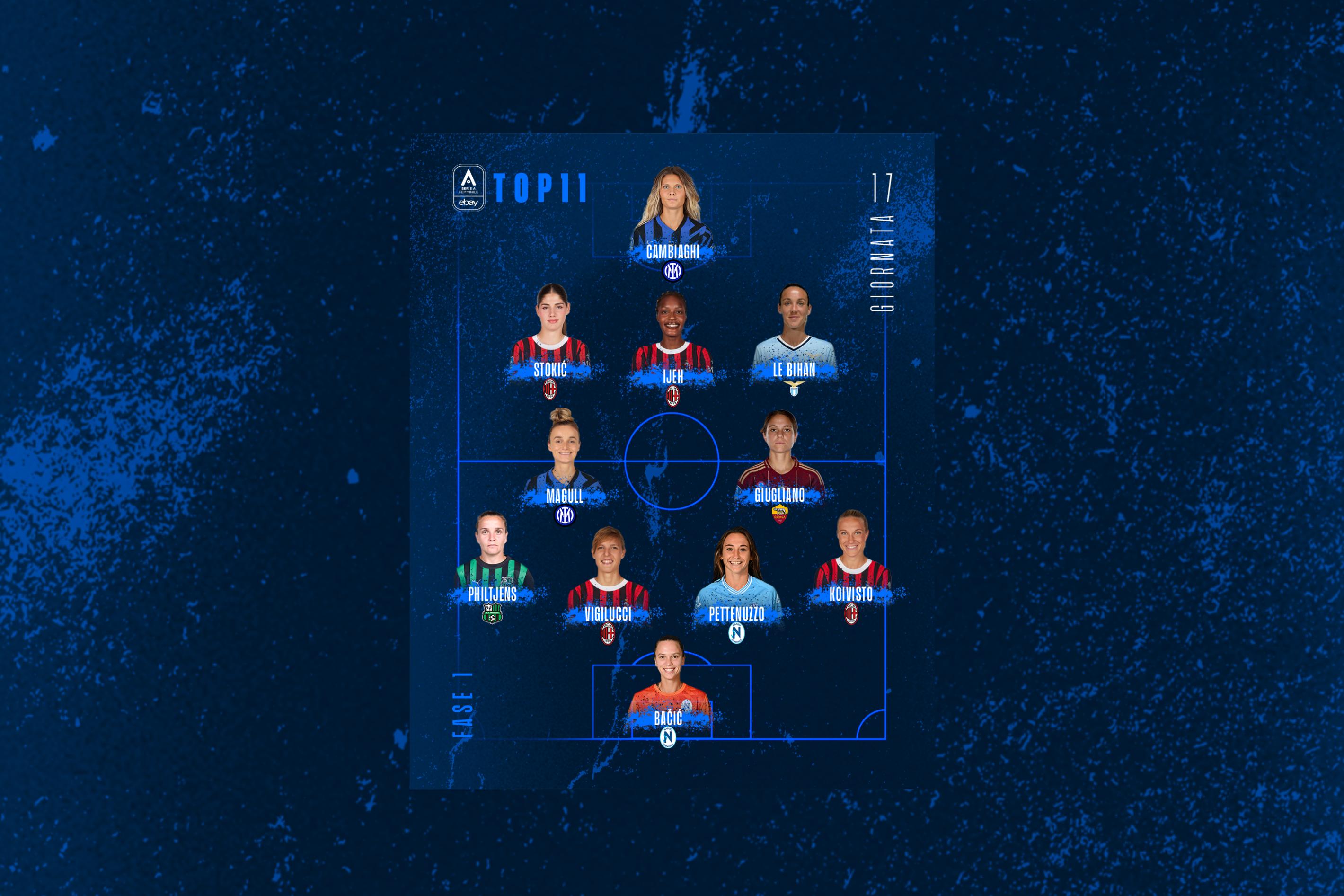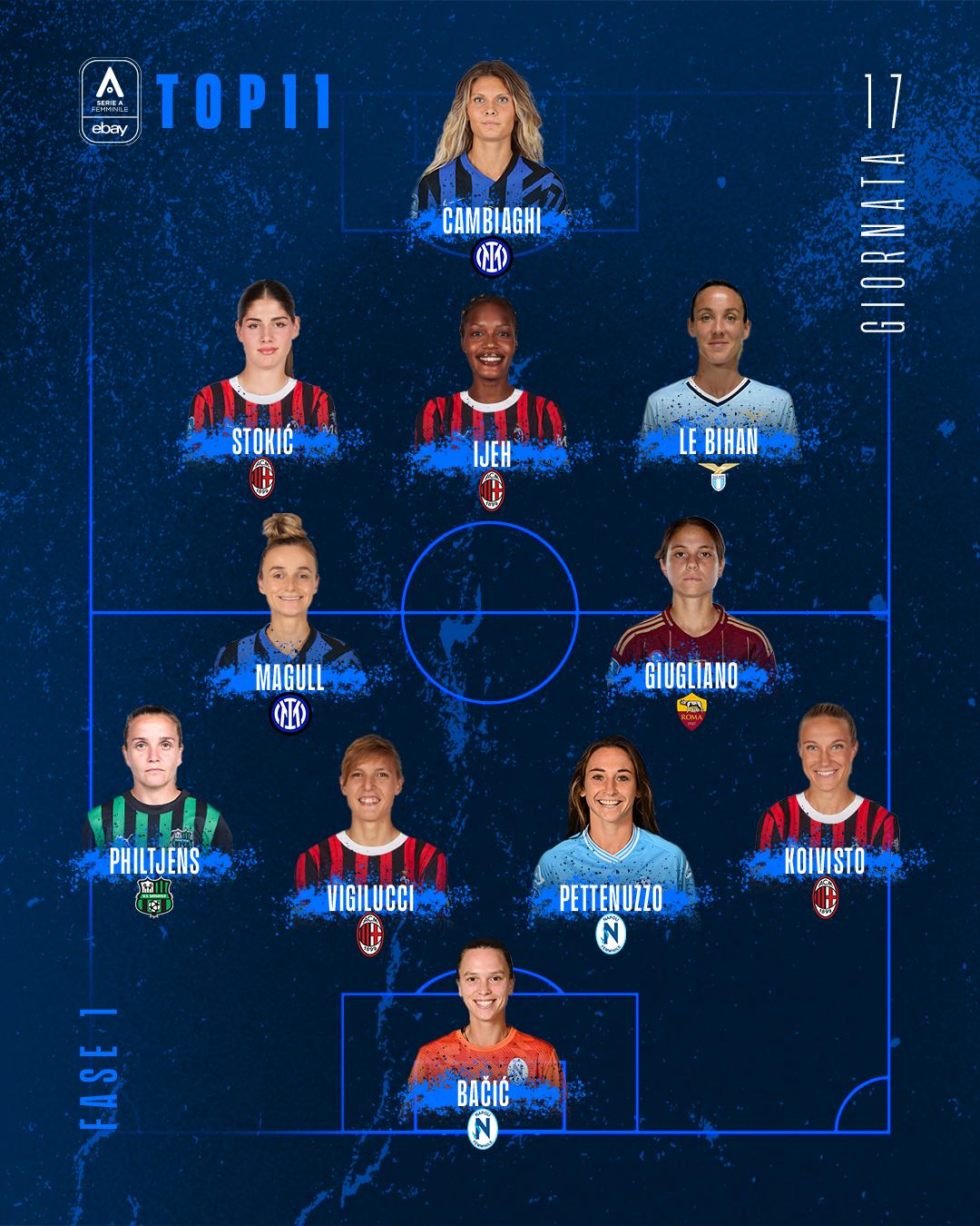 La clamorosa rimonta in casa del Sassuolo permette al Milan di portare quattro giocatrici nella Top 11 della 17ª giornata della Serie A eBay. A rappresentare il Diavolo ci sono Koivisto, Vigilucci, Stokić e Ijeh, le ultime tre autrici delle reti che hanno piegato le neroverdi di Philtjens, anche lei inserita nella formazione ideale del weekend.