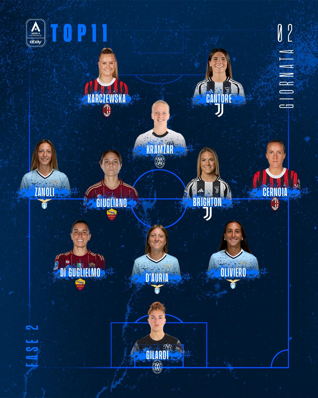 Dal trio della Lazio alle ‘coppie’ di Como, Milan, Juventus e Roma. Per il club lariano nella Top 11 della 2ª giornata delle poule scudetto e salvezza trovano spazio il portiere Astrid Gilardi - tra le più presenti in questa stagione - e la 19enne centrocampista Zara Kramzar, entrambe grandi protagoniste del 3-0 sul Sassuolo. Nel 2-2 tra rossonere e bianconere spiccano invece i nomi di Valentina Cernoia e Nikola Karczewska da una parte, di Abi Brighton e Sofia Cantore dall’altra. Presenti anche Lucia Di Guglielmo e Manuela Giugliano, le giallorosse che hanno deciso lo scontro diretto con l’Inter.