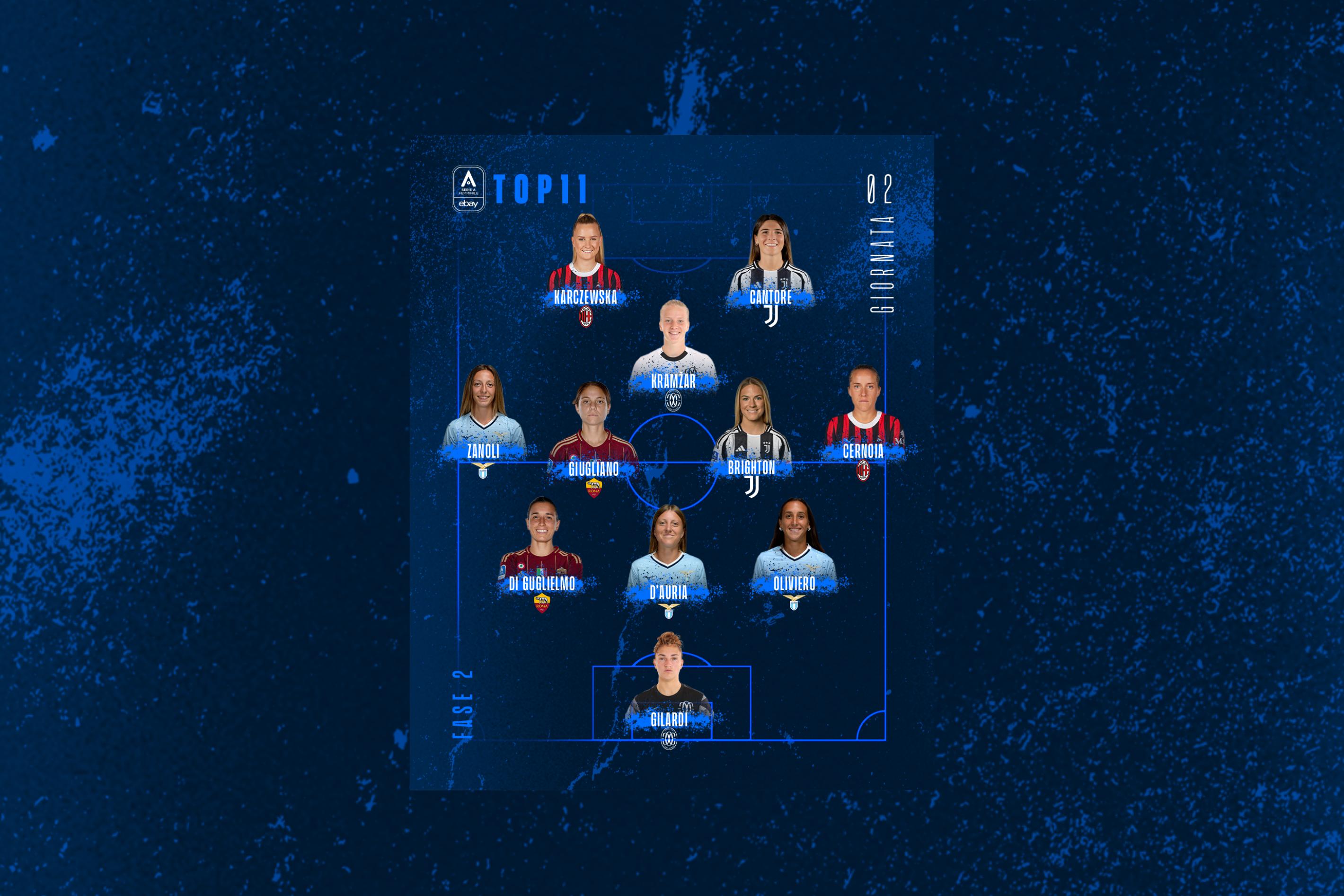 Dal trio della Lazio alle ‘coppie’ di Como, Milan, Juventus e Roma. Per il club lariano nella Top 11 della 2ª giornata delle poule scudetto e salvezza trovano spazio il portiere Astrid Gilardi - tra le più presenti in questa stagione - e la 19enne centrocampista Zara Kramzar, entrambe grandi protagoniste del 3-0 sul Sassuolo. Nel 2-2 tra rossonere e bianconere spiccano invece i nomi di Valentina Cernoia e Nikola Karczewska da una parte, di Abi Brighton e Sofia Cantore dall’altra. Presenti anche Lucia Di Guglielmo e Manuela Giugliano, le giallorosse che hanno deciso lo scontro diretto con l’Inter.