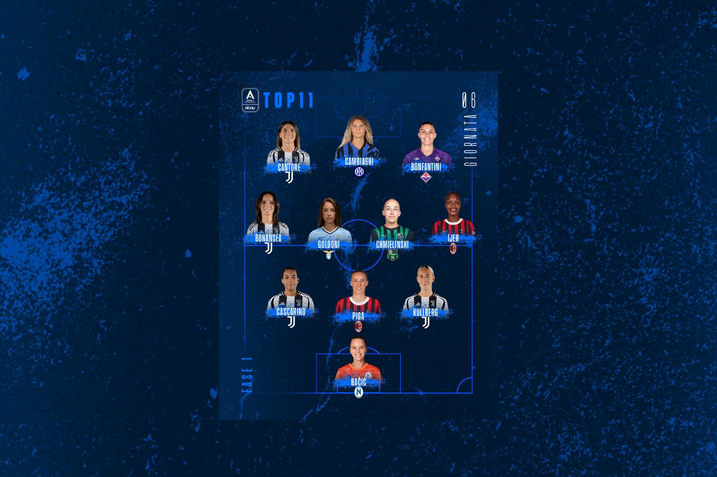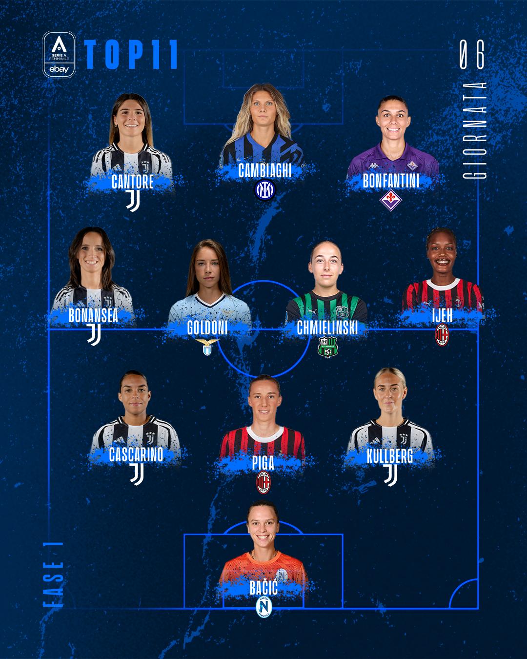 Dall'Allianz Stadium alla Top 11. Estelle Cascarino, Emma Kullberg, Barbara Bonansea e Sofia Cantore, protagoniste della sesta vittoria di fila della Juventus in Serie A Femminile eBay, portano il club bianconero in massa nella formazione migliore del weekend. In porta c'è Doris Bacic, 'muro' nel pareggio del Napoli Femminile sul campo della Lazio, che invece 'schiera' Eleonora Goldoni; due giocatrici del Milan che ha battuto la Sampdoria (Piga e Ijeh) e poi diverse marcatrici. Da Chmielinski (Sassuolo) alle Azzurre Michela Cambiaghi (match winner per l'Inter a Como) e Agnese Bonfantini, autrice del pareggio della Fiorentina a Sassuolo prima delle reti di Severini e Boquete.