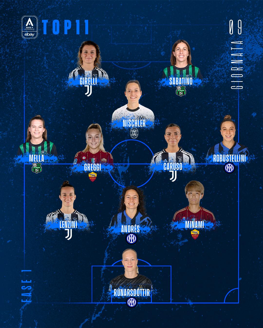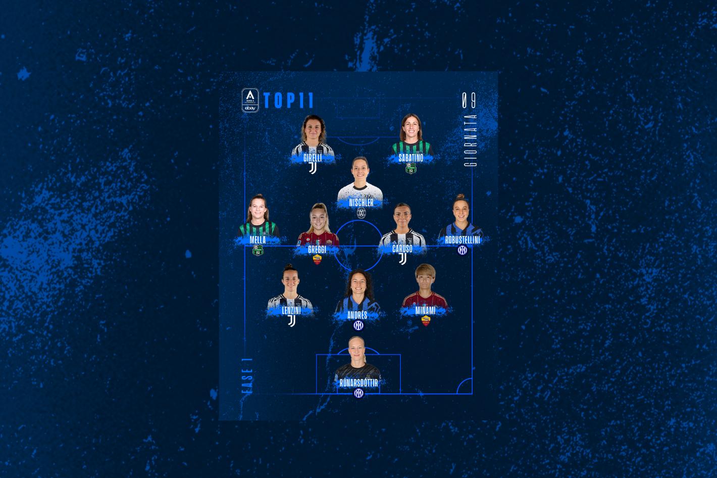 C’è tanto, tantissimo azzurro nella Top 11 della 9ª giornata di campionato. Sono infatti ben otto le giocatrici italiane inserite nella formazione ideale del weekend, sei delle quali autrici di (almeno) una rete. Sono finite sul tabellino delle marcatrici la bianconera Caruso, la giallorossa Greggi e la nerazzurra Robustellini, senza dimenticare Nischler, la centrocampista del Como schierata alle spalle della coppia formata dalle intramontabili Girelli (classe 1990) e Sabatino (1985), che a suon di gol e assist hanno trascinato Juve e Sassuolo nelle vittorie con Milan e Sampdoria.
