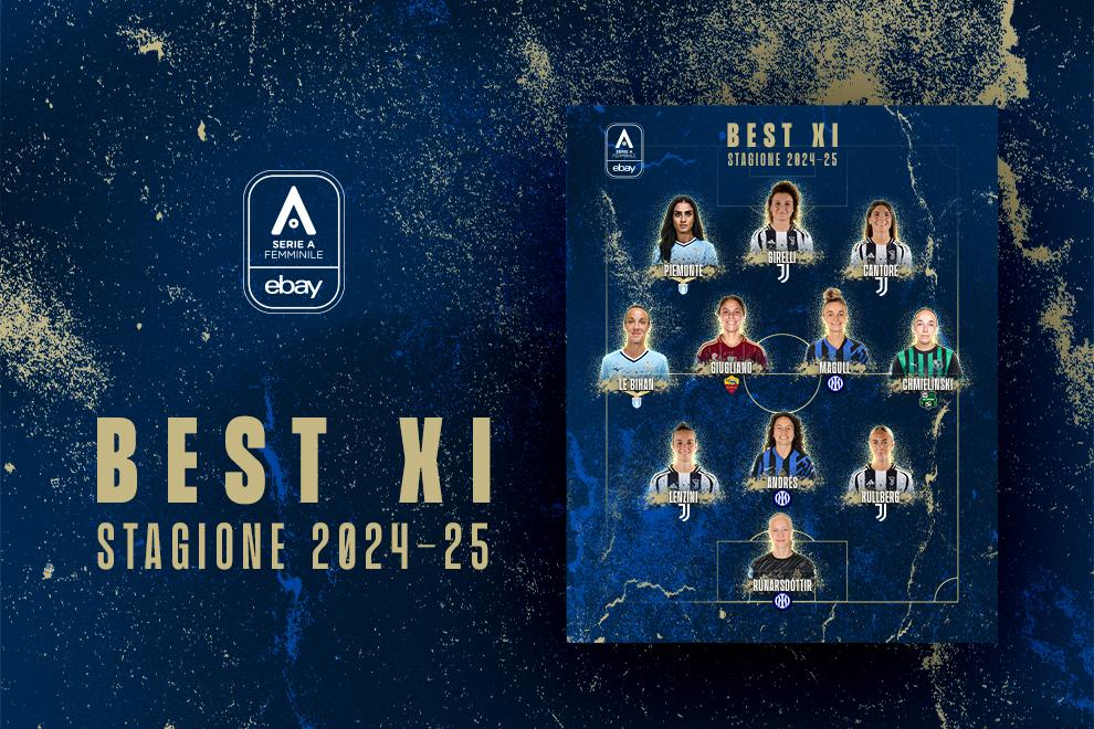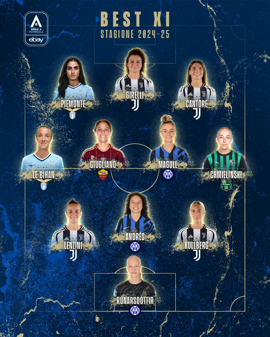 Con la proclamazione della Top 11, la Serie A Femminile chiude la stagione 2024-25: tra le protagoniste, ovviamente, ci sono le MVP premiate a Roma il 5 maggio (Cecilía Rúnarsdóttir, Ivana Andrés, Gina Chmielinski, Sofia Cantore, Cristiana Girelli), ma anche altre sei calciatrici che hanno disputato un grande campionato. Da Emma Kullberg e Martina Lenzini, anche loro protagoniste dello scudetto bianconero, a Lina Magull, pilastro dell'Inter che ha raggiunto la prima storica qualificazione alla UEFA Women's Champions League. Ma c'è spazio anche per la Roma, con Manuela Giugliano, e per la Lazio, con Clarisse Le Bihan e Martina Piemonte.