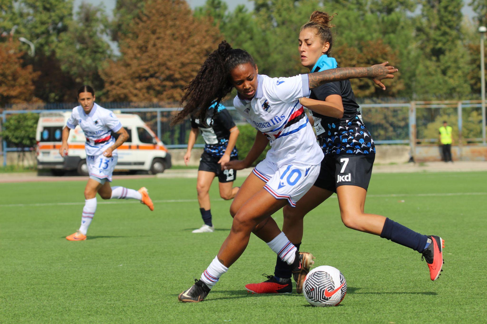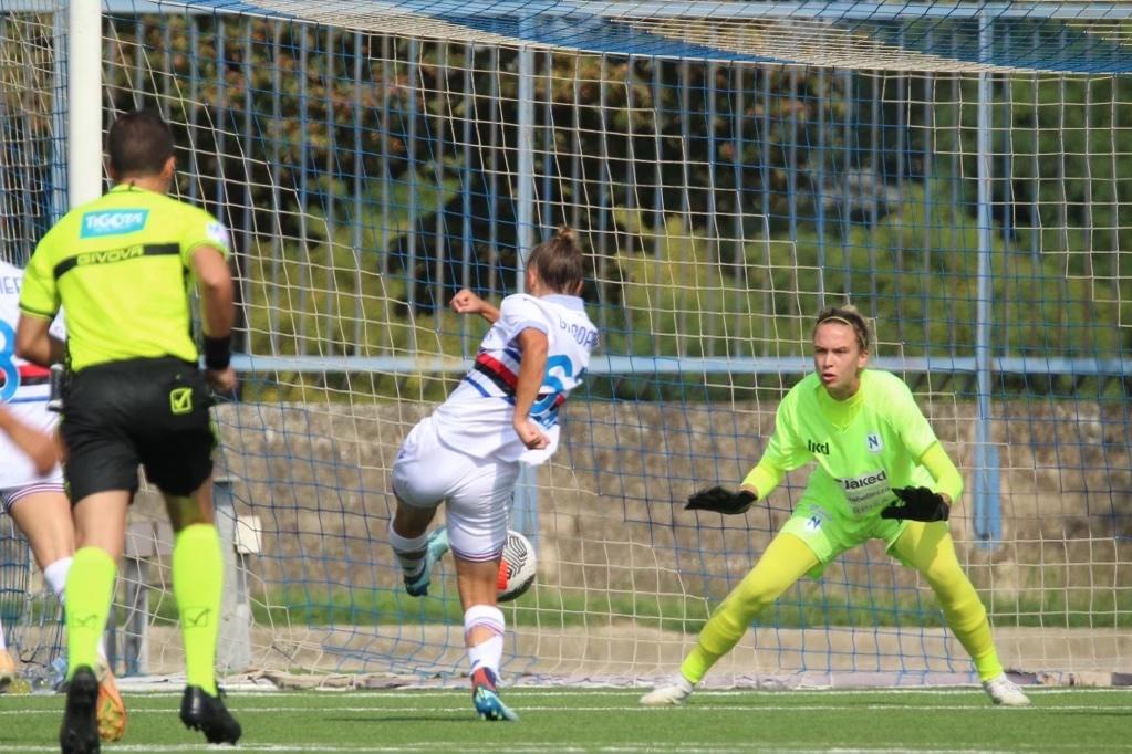 Questo sabato di Serie A però si è aperto nel primo pomeriggio con il match del Piccolo tra Napoli e Sampdoria. Le blucerchiate hanno conquistato i loro primi tre punti della stagione, mentre le campane sono l’unica squadra ancora a secco. Il 2-0 delle ospiti è maturato tutto nel primo tempo: al 6’ è stata De Rita a sbloccare subito la gara. La numero 14 della Samp è stata la più veloce a ribadire in rete il pallone inizialmente respinto da Bacic dopo la conclusione di Giordano: oltre ad aver realizzato il gol che ha sbloccato l’incontro, De Rita è stata la blucerchiata con più tiri totali (tre al pari di Giordano) e palloni intercettati (due) nella partita. Non solo, la calciatrice ha segnato un gol in ognuna delle ultime quattro stagioni disputate in Serie A; in generale, tutte le sue quattro reti nella competizione sono arrivate in trasferta e nel corso del primo tempo. Cinque minuti più tardi la Samp è andata a un passo dal raddoppio con il guizzo di Battelani che ha calciato dalla grande distanza provando a sorprendere Bacic ma la palla è uscita di poco. Le ospiti comunque non hanno impiegato tanto a siglare il raddoppio, arrivato al 19’ con la firma di Giordano, autrice di una rete pregevole. La numero 67 della Sampdoria ha così festeggiato le sue 50 presenze in blucerchiato. Con il suo tocco sotto preciso col mancino ha di fatto chiuso la gara e fissato il risultato definitivo sullo 0-2. Il Napoli si è acceso sul finale del primo tempo con le occasioni di Chmielinski e Banusic che tuttavia non sono riuscite a concretizzare. Nella ripresa la Samp è andata vicino al tris con De Rita, Benoit e Giordano, mentre le partenopee hanno cercato di reagire con gli sprint e le conclusioni di Corelli, che prima ha impegnato Tampieri e poi ha sfiorato il palo, e di Kobayashi che però non sono state in grado di riaprire il match.