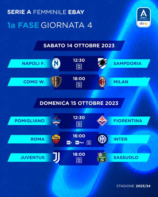 LE ALTRE PARTITE – Il turno si aprirà domani alle 12.30 con l’incontro tra Napoli e Sampdoria, che nonostante siano ancora ferme a zero punti sono reduci dalle convincenti vittorie negli ottavi di Coppa Italia. Alle 18 al ‘Ferruccio Trabattoni’ di Seregno il Como Women ospiterà il Milan, chiamato alla rimonta in classifica dopo i due ko con Roma e Juventus.