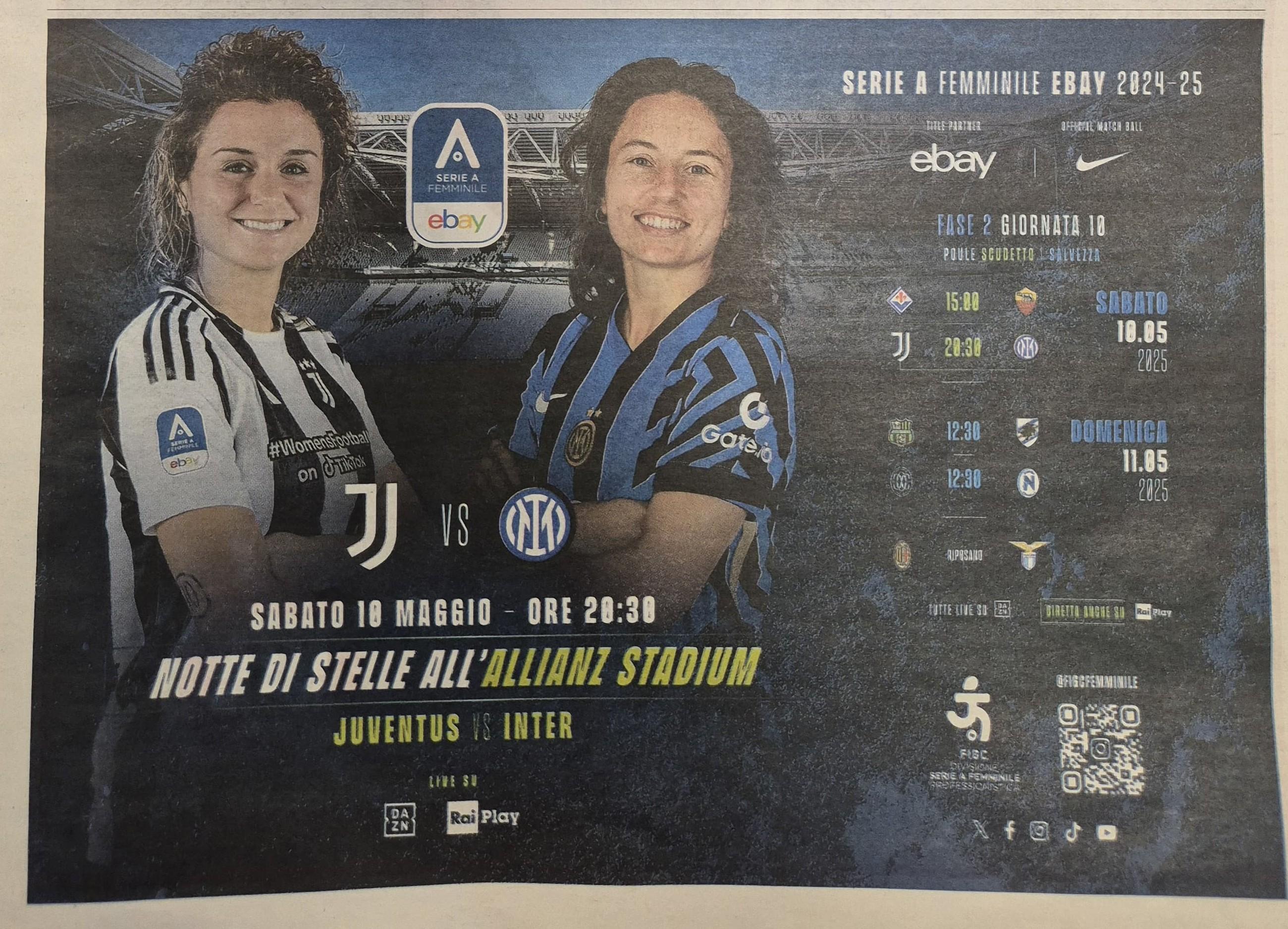 "Notte di stelle all'Allianz Stadium". Questo il claim scelto oggi per presentare Juventus-Inter su Corriere dello Sport-Stadio e Tuttosport, media partner della Divisione Serie A Femminile Professionistica. Mezza pagina con i volti sorridenti di Cristiana Girelli e Ivana Andres che, dopo essersi trovate lunedì scorso sul palco di Officine Farneto per 'Frecciarossa Game On - Women in Sport' (l'attaccante della Juventus è stata premiata come MVP assoluta della stagione, mentre la spagnola dell'Inter ha vinto il premio di miglior difensore), stasera saranno avversarie in un evento che andrà oltre i 90 minuti.