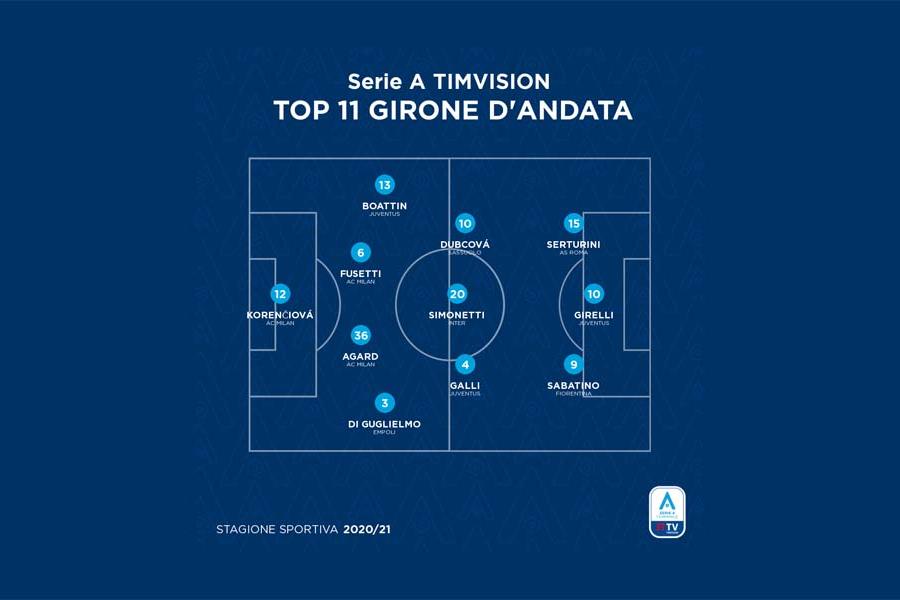 Questa speciale top 11, creata sulla base di un indice statistico che tiene conto di tutti i parametri individuali e di squadra di una calciatrice, rispecchia i valori espressi nella prima parte di campionato. I club più rappresentati - tre calciatrici a testa - sono infatti i due che comandano la classifica, Juventus e Milan, ma nell’undici ideale c’è spazio anche per Empoli, Fiorentina, Inter, Roma e Sassuolo.