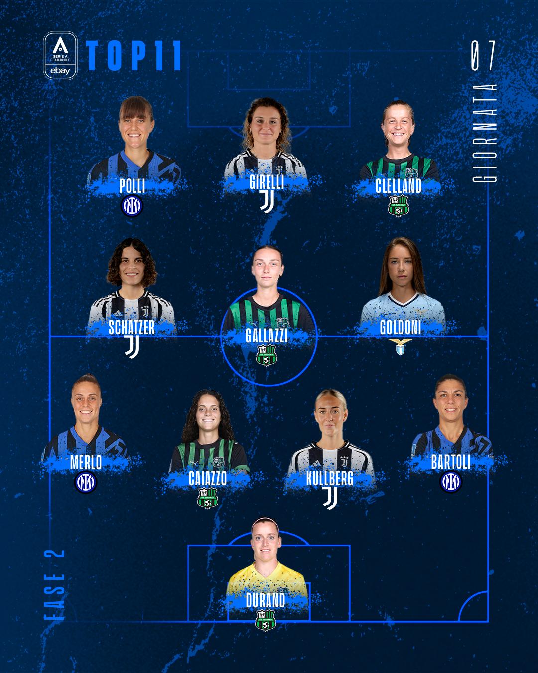La settima della poule scudetto e della poule salvezza è stata la giornata che ha incoronato la Juventus campione d'Italia. E la presenza nella Top 11 di Emma Kullberg, Eva Schatzer e Cristiana Girelli certifica anche la prestazione con cui la squadra di Max Canzi ha battuto il Milan cucendosi aritmeticamente il tricolore sul petto. La squadra più rappresentata è però il Sassuolo, con Durand, Caiazzo, Gallazzi e Clelland, in una squadra completata dall'Inter con Merlo, Bartoli e Polli (le nerazzurre, battendo la Roma, hanno blindato un posto in UEFA Women's Champions League) e dalla laziale Eleonora Goldoni.
