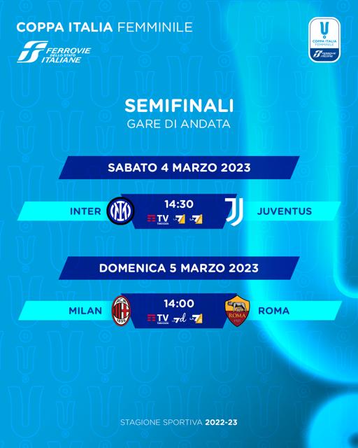 Saranno le semifinali della Coppa Italia Ferrovie dello Stato Italiane a dare il via alla seconda parte della stagione del calcio femminile italiano, che proseguirà con la novità delle poule scudetto e salvezza, con il gran ballo europeo della Roma (attesa dal doppio confronto con il Barcellona in Champions League), con l’atto finale della competizione iridata e, per finire, con l’attesissimo Mondiale in Australia e Nuova Zelanda. Si partirà dunque dal primo atto di Inter-Juventus e Milan-Roma, mentre sabato 11 marzo alle 14.30 si disputeranno le gare di ritorno.