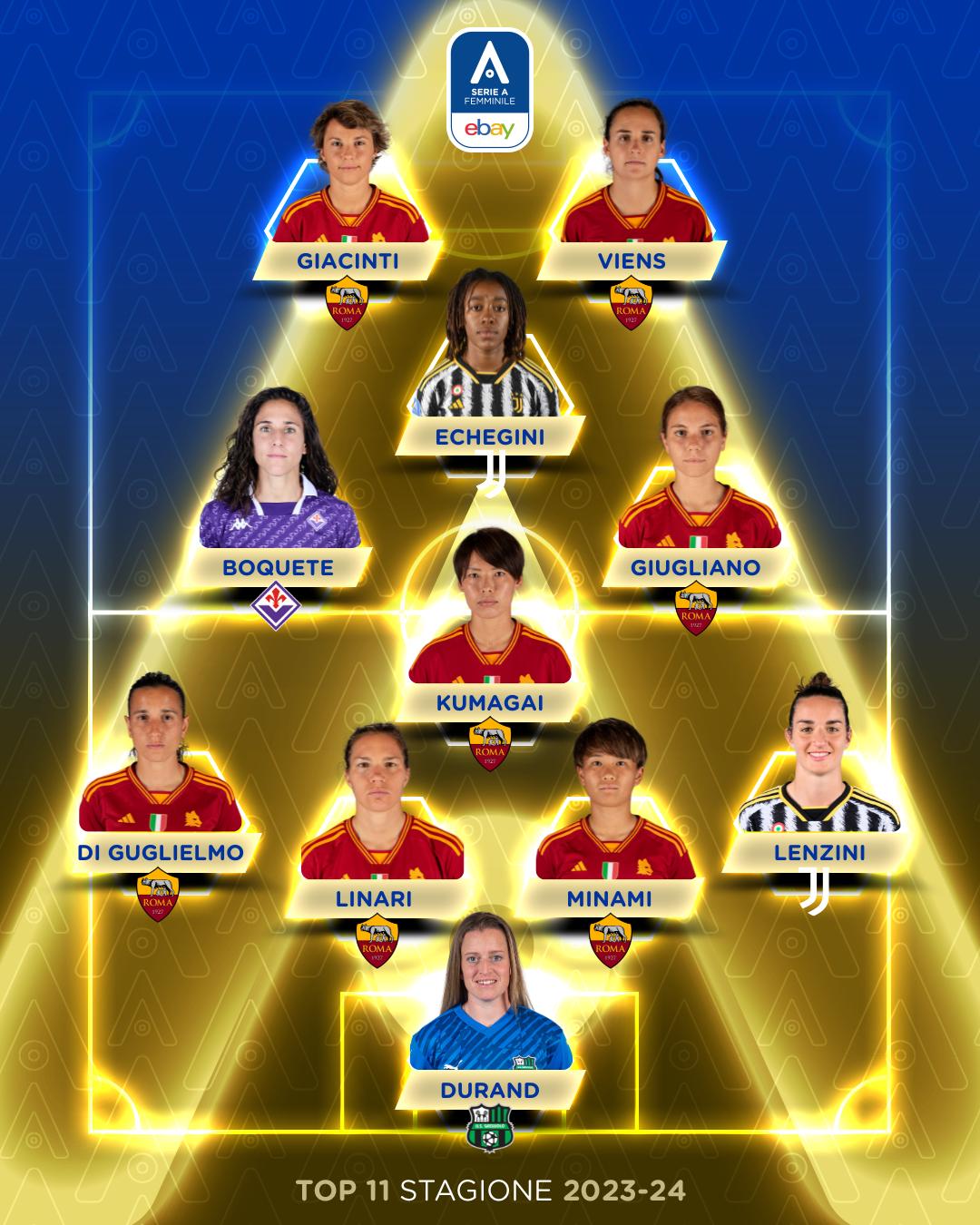 Il secondo titolo consecutivo conquistato dalla Roma trova ampio spazio anche nella formazione ideale dell’anno. Sono infatti ben sette le giallorosse presenti nell’undici tipo della stagione: da Linari a Minami, da Di Guglielmo a Giugliano, passando per Kumagai, finendo con le due attaccanti Giacinti e Viens, quest’ultima vincitrice della classifica marcatrici. Tra i pali la novità assoluta è Durand del Sassuolo; in difesa completa il pacchetto arretrato Lenzini della Juventus; a centrocampo certifica l’ottima stagione della Fiorentina Vero Boquete. In attacco, alle spalle delle due romanista, Jennifer Echegini, andata in doppia cifra con la maglia della Juventus. Ecco lo schieramento completo secondo le statistiche Opta.