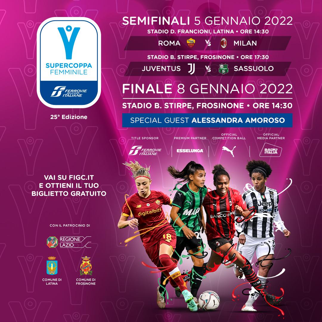 Match Programme - Come da tradizione, in attesa di lasciare la parola al campo, la Divisione Calcio Femminile ha pubblicato il Match Programme della competizione (per consultarlo clicca qui): nel documento si potranno consultare le statistiche dei quattro club partecipanti, i dati individuali di ogni calciatrice che prenderà parte all’evento, un approfondimento sulla partnership con Ferrovie dello Stato Italiane, Title Sponsor della 25ª edizione della Supercoppa, e sulle nuove iniziative portate avanti con Radio Italia ed Esselunga, che in occasione delle semifinali regalerà le calze della Befana ai bambini presenti allo stadio.