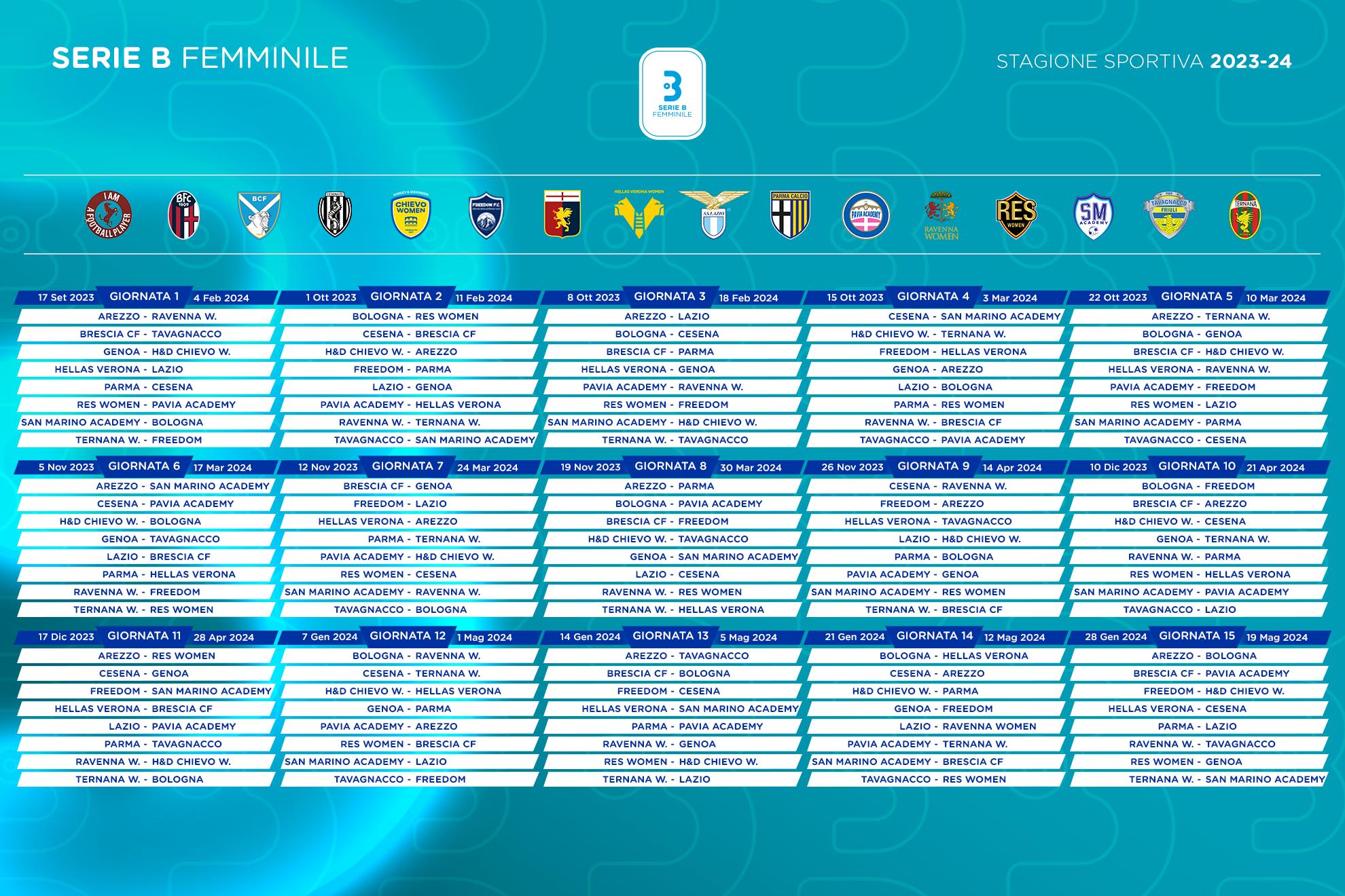 Domenica 17 settembre parte una nuova stagione per la Serie B Femminile. Sedici squadre al via, 30 giornate per decidere la squadra promossa in Serie A per la stagione 2024-25, quella che giocherà lo spareggio e le tre retrocesse in C. Il Parma, sceso a maggio dalla Serie A, debutta con il derby emiliano-romagnolo contro il Cesena; la Lazio, sconfitta dal Pomigliano nello spareggio di giugno, parte da Verona, sul campo dell'Hellas. Se Brescia-Tavagnacco vedrà sfidarsi due club che hanno fatto la storia del calcio femminile in Italia, Res Women-Pavia Academy sarà scontro diretto tra neopromosse.