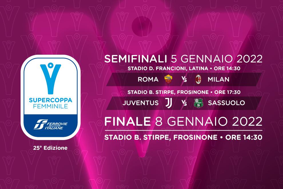 Venerdì 17 dicembre alle ore 11.30, presso la Sala Freccia Club della stazione Tiburtina di Roma, si terrà la conferenza stampa di presentazione della Final Four della Supercoppa Femminile Ferrovie dello Stato Italiane. La competizione, giunta alla 25a edizione, prenderà il via mercoledì 5 gennaio con le semifinali Roma-Milan (ore 14.30, stadio ‘Francioni’ di Latina) e Juventus-Sassuolo (ore 17.30, stadio ‘Stirpe’ di Frosinone) e si chiuderà con la finalissima in programma domenica 8 gennaio alle 14.30 allo stadio ‘Stirpe’ di Frosinone.