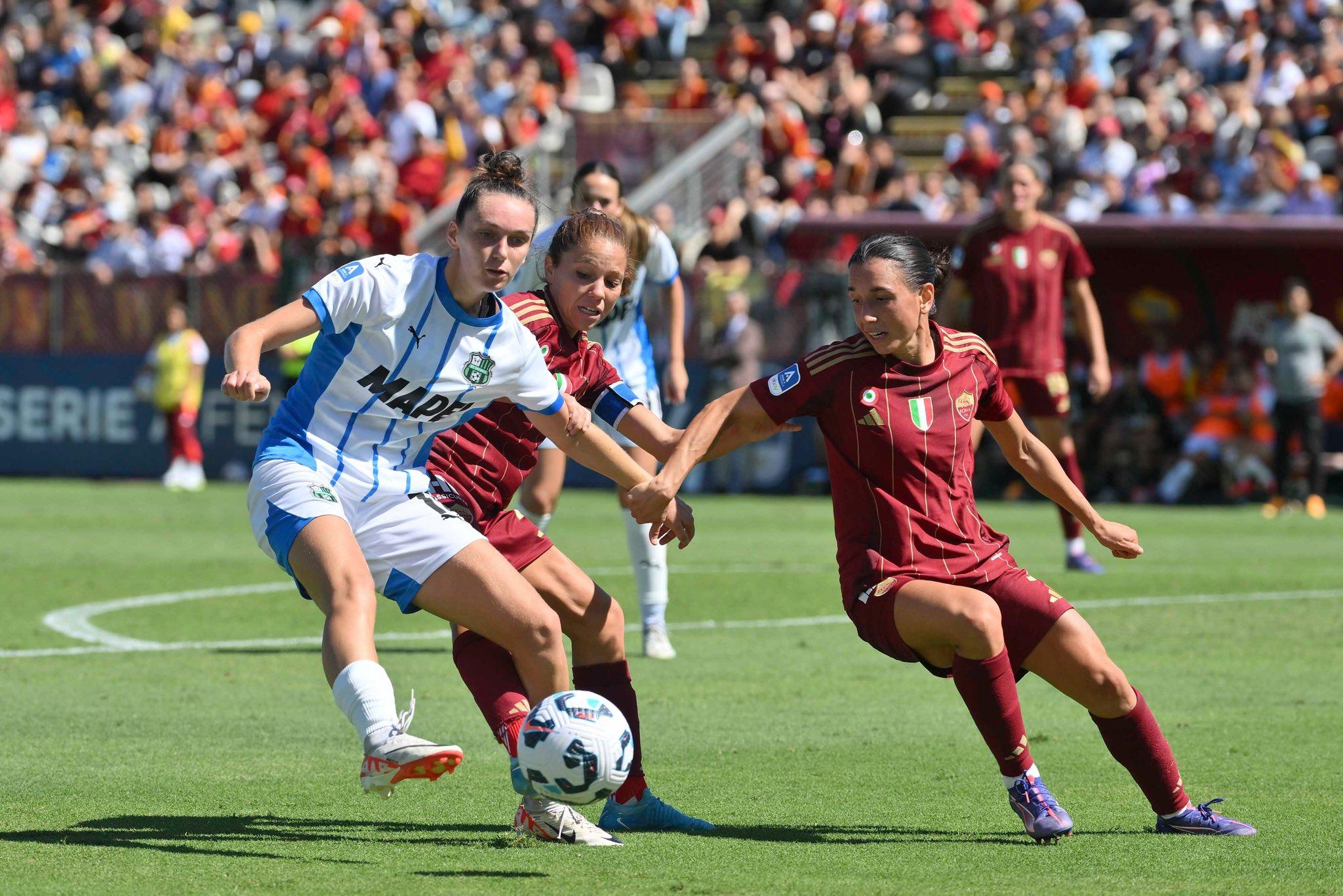 Partenza con il freno a mano tirato per la Roma Campione d’Italia: le giallorosse, dopo il 2-2 raggiunto all’ultimo secondo con la Lazio nel primo turno di campionato, non vanno oltre l’1-1 nel debutto stagionale casalingo con il Sassuolo. Nel lunch match del sabato al Tre Fontane, anticipato dalla premiazione di quattro delle sei MVP della Serie A eBay 2023/24 da parte della presidente della Divisione Serie A Femminile Federica Cappelletti (consegnate quattro targhe celebrative a Durand, Linari, Giugliano e Viens), è arrivato il secondo segno X per le capitoline, che ne hanno registrati due consecutivi solo per la terza volta nella competizione. Davanti al loro pubblico partono determinate le undici di Spugna, che dopo una manciata di secondi sfiorano il vantaggio: cross di Greggi (alla 150ª presenza con la Roma in tutte le competizioni) da sinistra per Giacinti e incornata fuori dallo specchio per la numero nove giallorossa. Le padrone di casa insistono e al quarto d’ora sbloccano il parziale: Kumagai guadagna un calcio di punizione dal limite e Giugliano lo trasforma con una pennellata di destro perfetta. L’entusiasmo per il vantaggio svanisce però un minuto più tardi, con un’altra prodezza che riporta tutto in equilibrio. L’autrice questa volta è Clelland, che vede Ceasar fuori dai pali e la beffa da distanza siderale. Dopo il pareggio le neroverdi sfiorano il sorpasso prima con Prugna e poi con Gallazzi, neutralizzate però da due grandi interventi del portiere della Roma. Per le capitoline rispondono Kumagai e Giugliano, ma alla fine del primo tempo il parziale rimane invariato, con le due formazioni ben messe in campo e attente a non concedere spazi.