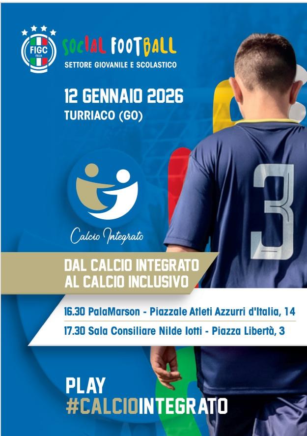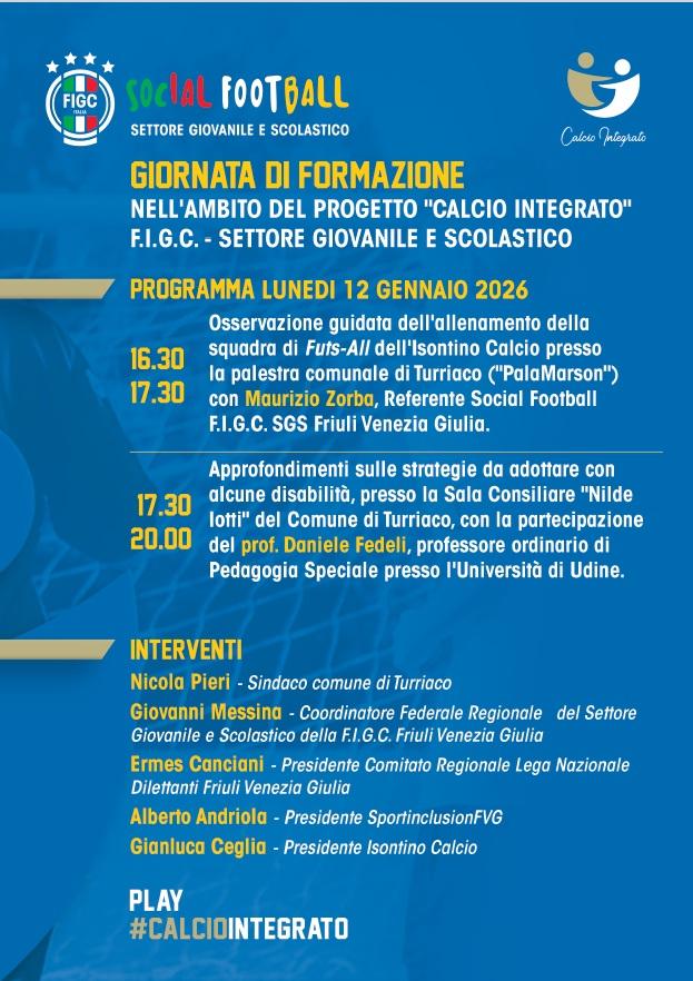 Il Settore GIovanil e Scolastico del Friuli Venezia Giulia organizza lunedì 12 gennaio 2026 un incontro informativo dal titolo “Dal Calcio integrato al Calcio inclusivo”. L’evento prevede una prima fase in palestra, in cui sarà possibile visionare un allenamento di calcio integrato/inclusivo, sotto la regia del Referente Social Football del Coordinamento Regionale FIGC SGS Maurizio Zorba. Seguirà presso la sala consiliare di Turriaco (GO) l’incontro formativo con la partecipazione graditissima del prof. Daniele Fedeli, professore ordinario di Pedagogia Speciale dell’Università di Udine, il quale approfondirà strategie pratiche da utilizzare sia in riferimento ad alcune disabilità sia nei casi di alcuni disturbi Specifici dell’Apprendimento (DSA).