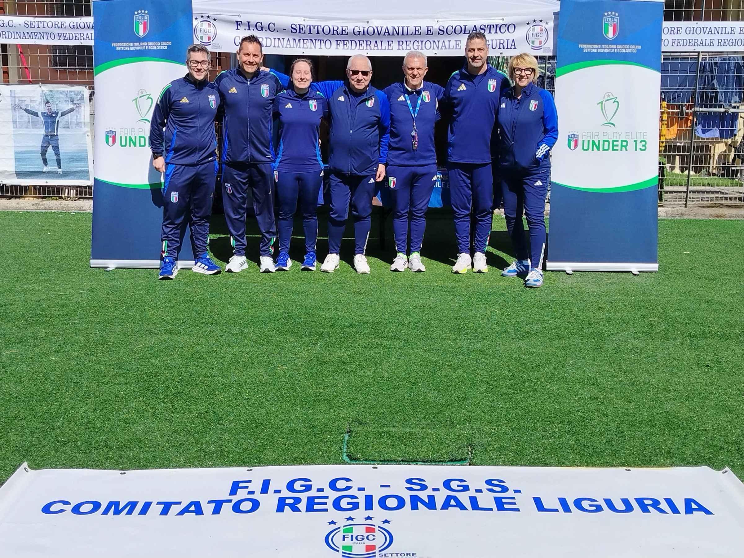 Lo Staff SGS presente: Aldo Fuggetta (Coordinatore Federale), Mara Morin (Del.Reg. Attività di Base), Francesca Casanova (Del. Reg. Calcio Femminile, Roberto Balzan (ROR e Resp. Segreteria m) , Livio Guido Ghisi (RT CFT e RTT AST Genova), Alessio Bertoli (Del. Reg. Calcio a 5 e Beach Soccer, Matteo Ricciarelli (Allenatore CFT e AST Genova) e lo ‘speaker’ della manifestazione Celestino Santomauro (Resp. Reg. Comunicazione).