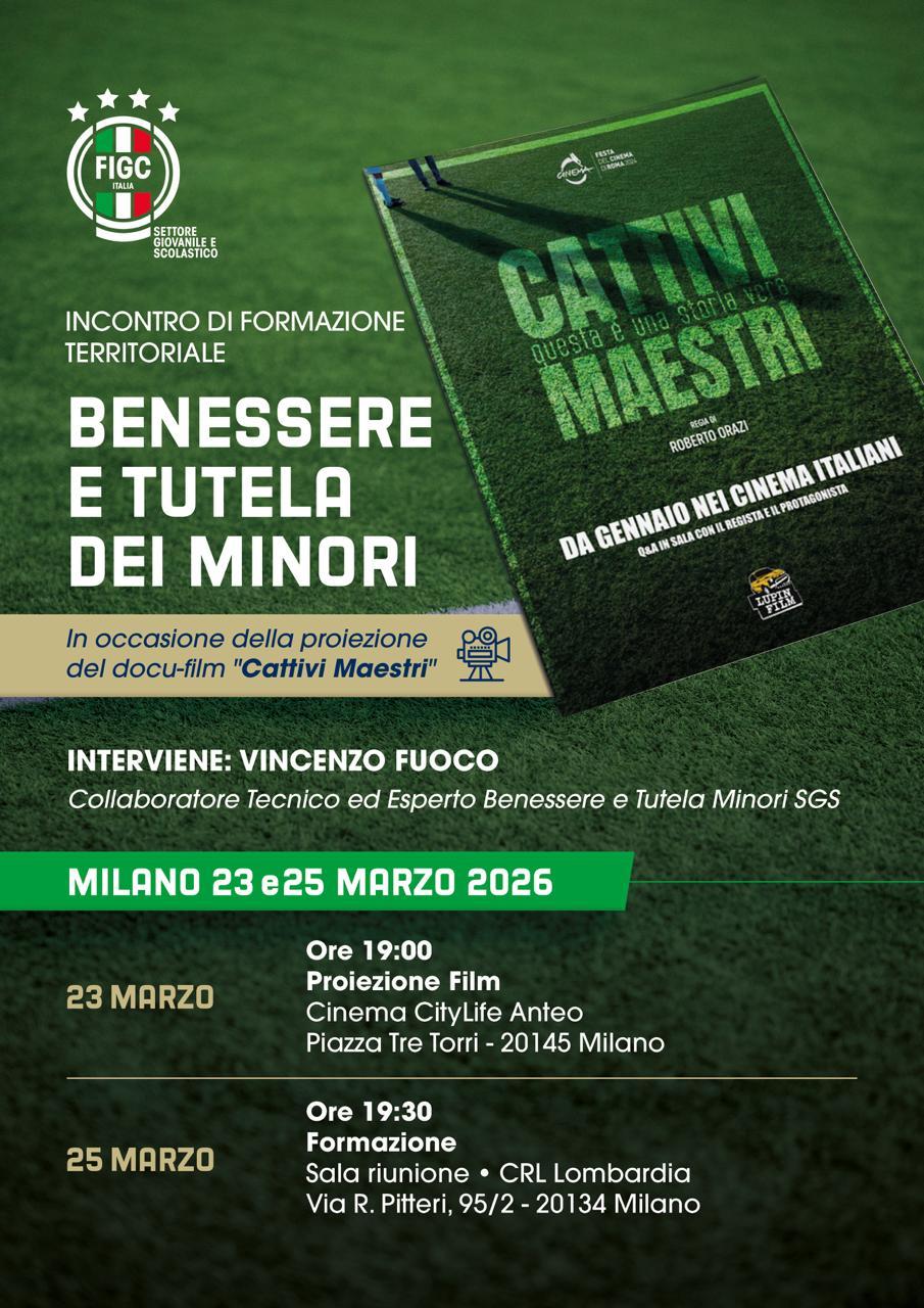 L’iniziativa, in programma a Milano nelle giornate del 23 e 25 marzo, si inserisce all’interno di un percorso di sensibilizzazione e formazione rivolto a tutti: associazioni sportive, dirigenti, tecnici, educatori e famiglie. Il primo momento sarà dedicato alla proiezione del docu-film “Cattivi Maestri”, diretto da Roberto Orazi e realizzato con il patrocinio del CONI e il supporto della UEFA. L’appuntamento è fissato per il 23 marzo alle ore 19:00 presso il Cinema CityLife Anteo, alla presenza del regista e di Vincenzo Fuoco, figura centrale del racconto.
