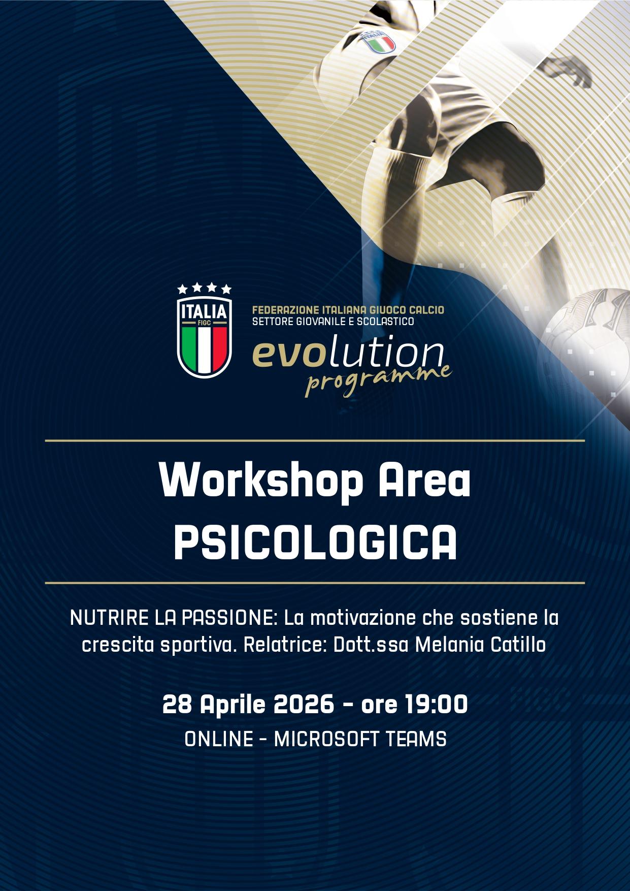 Il workshop sarà condotto dalla Dott.ssa Melania Catillo, Psicologa Territoriale FIGC - SGS e si tratteranno temi riguardanti la motivazione alla pratica sportiva.
