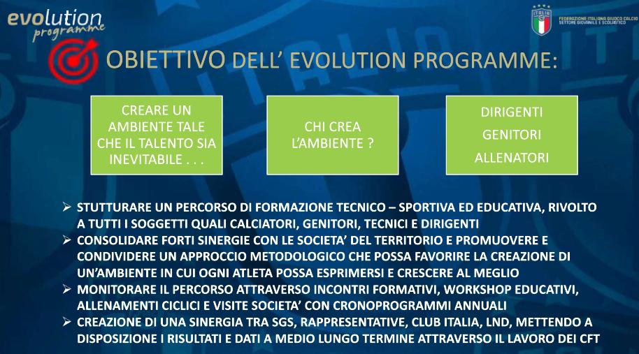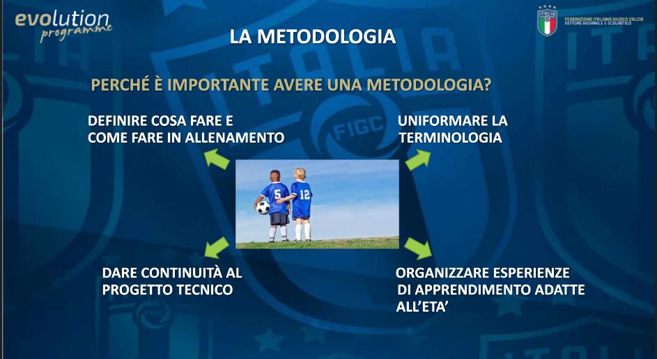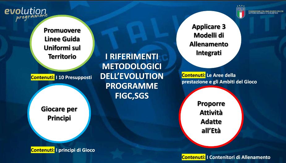 Subito dopo l'intervento di Giuseppe Milella, Responsabile Tecnico del CFT Ruvo di Puglia e AST Bari 1 e Selezionatore Tecnico U15 Femminile Puglia e Basilicata il quale, dopo aver spiegato gli obiettivi dell'Evolution Programme, ha analizzato il motivo dell'importanza de "la metodologia" e quali sono i criteri di definizione dei contenuti della metodologia. Successivamente focus sul tema del webinar: i riferimenti metodologici dell'Evolution Programme FIGC SGS. "Nella programmazione dell'attività e dell'organizzazione delle sedute di allenamento - definisce Giuseppe Milella - si adeguano quattro aree della metodologia: emotiva, tecnica, tattica e motoria".
