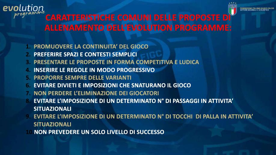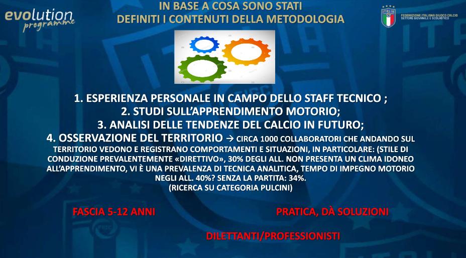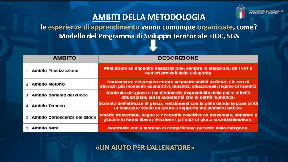 "Sono tre i modelli di allenamenti integrati da applicare in base alle categorie di riferimento (Piccoli Amici/Primi Calci - Pulcini- Esordienti) e sei gli ambiti di gioco: finalizzazione, dominio del gioco, motorio, gara, tecnico e conoscenza del gioco".
