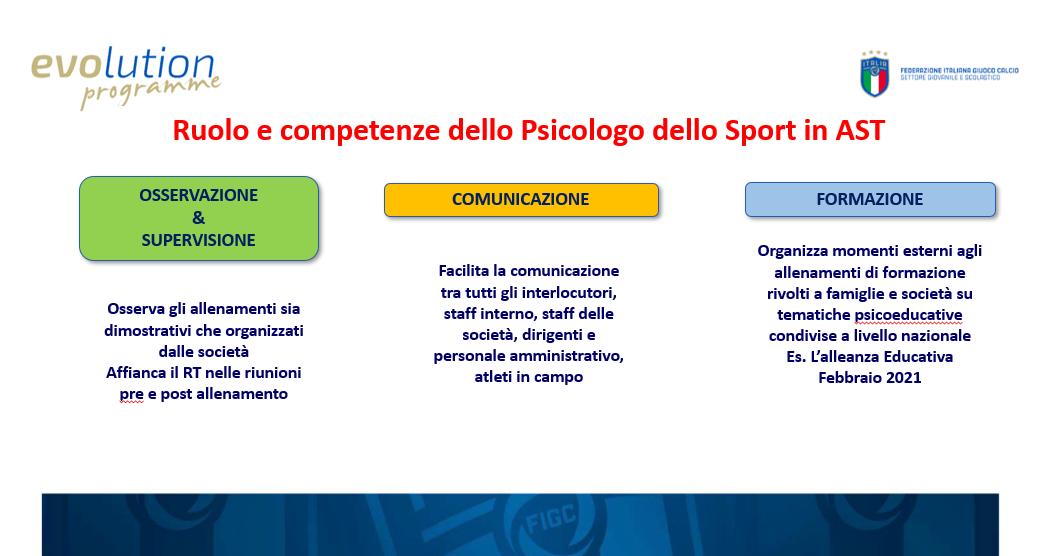 A seguire la Dott.ssa Iolanda Gisondo rileva la modalità esperienziale che si concretizzerà nella pratica sui terreni di gioco e spiega attraverso la visualizzazione di alcune slide il ruolo, le competenze dello Psicologo nei CFT e AST e le attività che si svolgono come i workshop multidisciplinari e i laboratori.