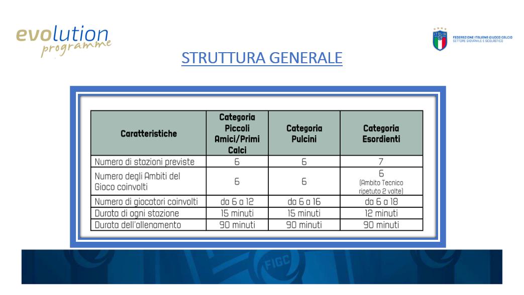 Subito dopo il Responsabile Tecnico Giuseppe Milella ringrazia i presenti e illustra la struttura generale che comprende i tre modelli dell'attività di base con delle specifiche caratteristiche e sei ambiti in base alle Categorie di riferimento (Piccoli Amici/Primi Calci - Pulcini - Esordienti).