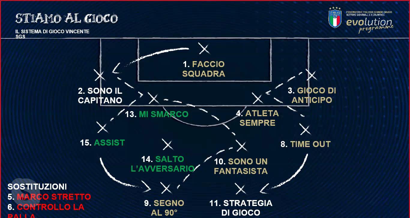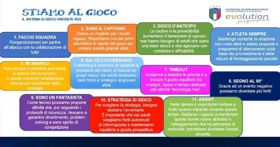 La Psicologa Maria Luisa Giancaspro introduce la sua relazione dichiarando l'importanza dell'incontro seppur virtuale come momento di condivisione e di vicinanza: "Abbiamo pensato a questo momento per proseguire quel percorso di informazione che ci consente di rimanere in contatto sul programma di sviluppo territoriale. 'Il calcio non si ferma' e, quindi noi 'Stiamo al Gioco' - illustra la Dott.ssa Giancaspro - Abbiamo attraversato un periodo lungo e complesso in cui sono emerse incredulità, impotenza, paura, rabbia, frustrazione. Ciascuno per la propria regione ha contribuito a lavorare a dei punti del 'Sistema di gioco vincente SGS' facendo squadra, diventando un modello per i nostri ragazzi e quindi essere un "capitano", giocando d'anticipo, ricordando ai ragazzi di essere sempre un'atleta, smarcando, saltando l'avversario, riconoscendo il time out ovvero il tempo di riposo, di segnare al 90esimo, di essere un fantasista, di leggere la strategia di gioco e di fare assist. Abbiamo un grande senso di responsabilità. Aiutiamo i ragazzi a mantenere queste nuove abitudini e a cogliere il meglio e a utilizzarlo per crescere".