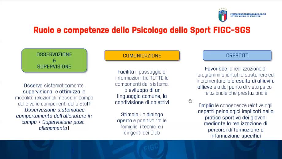 A seguire la relazione della Psicologa Dott.ssa Milena Ciullo che ha evidenziato l'importanza della figura dello Psicologo dello Sport nel Programma di Sviluppo Territoriale con il quale lo staff federale entra nelle Scuole Calcio, specificando quelle che sono le proprie competenze: "Lo psicologo entra in campo, 'osserva' quelle che sono le dinamiche tra tecnici e ragazzi, osserviamo le riunioni, nel pre e post allenamenti svolgiamo delle riunioni in cui diamo dei feedback su quello che abbiamo osservato durante gli allenamenti e quindi parliamo di 'comunicazione'. Un ruolo fondamentale è anche la formazione che stimola la 'crescita' dei ragazzi, dei tecnici e anche dei genitori".