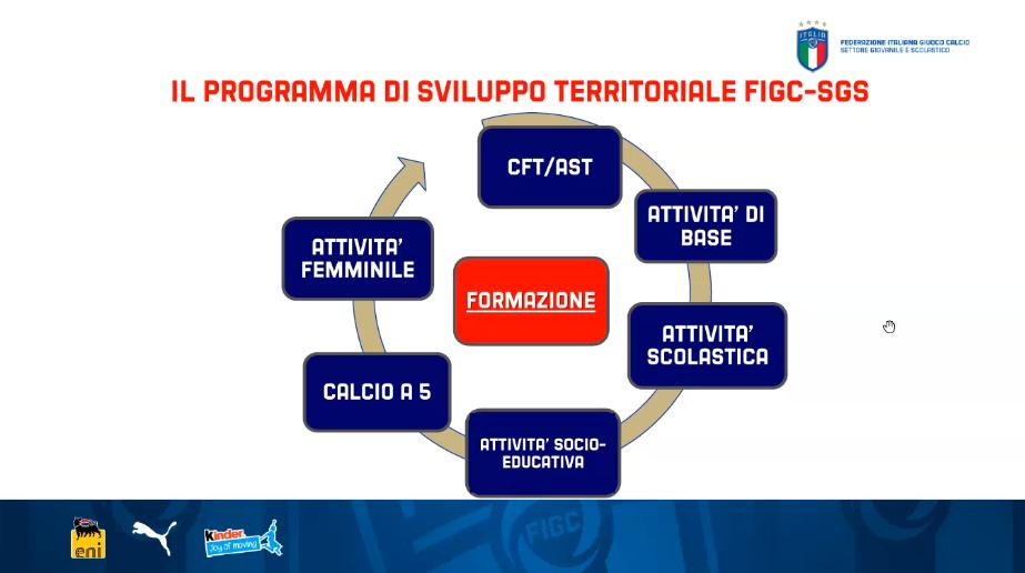 "Il nuovo programma - prosegue Mister De Giorgi - si articola in diverse progettualità rivolte a tutte le categorie di base attraverso il lavoro articolato nelle 60 Aree di Sviluppo Territoriale e 50 Centri Federali Territoriali dislocati sul territorio nazionale con il supporto delle nuove figure dei Tutor. Il Settore Giovanile e Scolastico intende coinvolgere le realtà del territorio affiancandole in un percorso di sviluppo e miglioramento. Per portare avanti un lavoro a 360°, nell’ambito del Programma di Sviluppo Territoriale, - conclude Mister De Giorgi - vengono individuate quattro diverse aree, ciascuna con competenze specifiche: Area Organizzativa, Area Tecnica, Area Psicologica/Educativa e Area Medico-sanitaria".