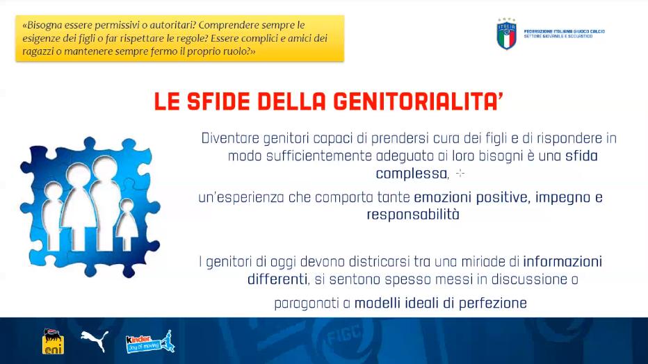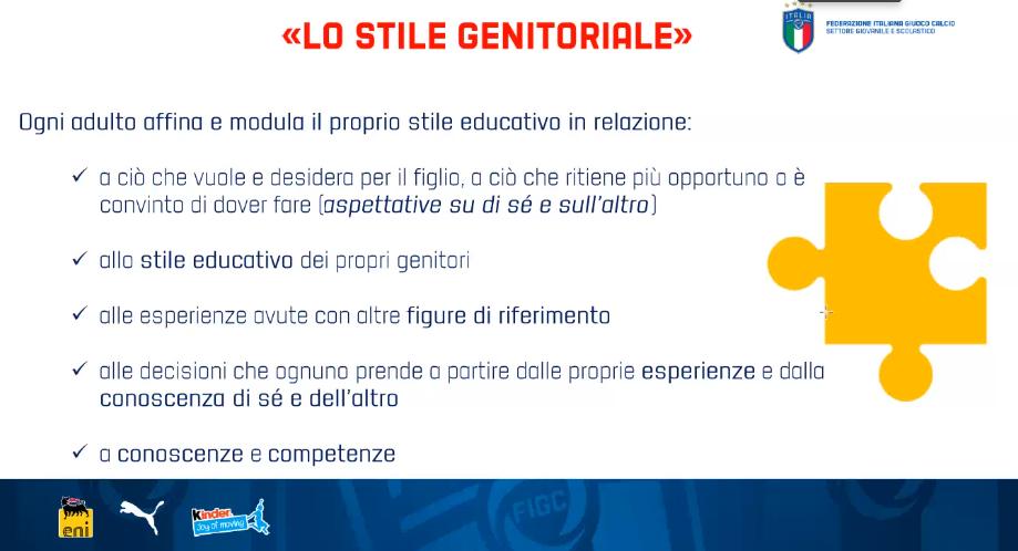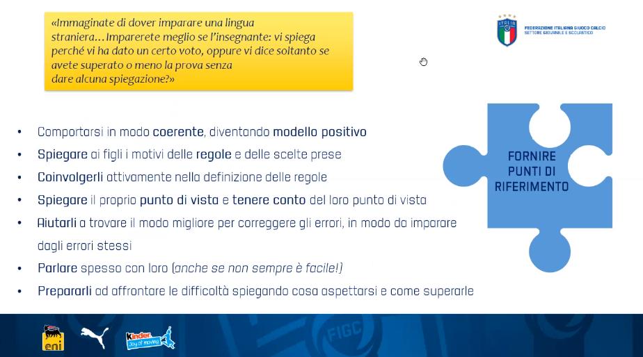 Si è concluso oggi pomeriggio, sabato 20 febbraio 2021, il primo workshop dell'area psicologica intitolato "L'alleanza educativa. Costruire una buona relazione genitori-figli" e organizzato dallo staff federale dell'Area di Sviluppo Territoriale di Lecce composto dal Responsabile Tecnico De Giorgi Tommaso; Psicologa Ciullo Milena; tecnici Di Bari Alessandra, Giuranna Luigi, Nuzzo Leo; preparatore dei portieri Vetrugno Alez; preparatore atletico La Mazza Giovanni; medico Cazzetta Luigi e fisioterapista Balena Francesco.