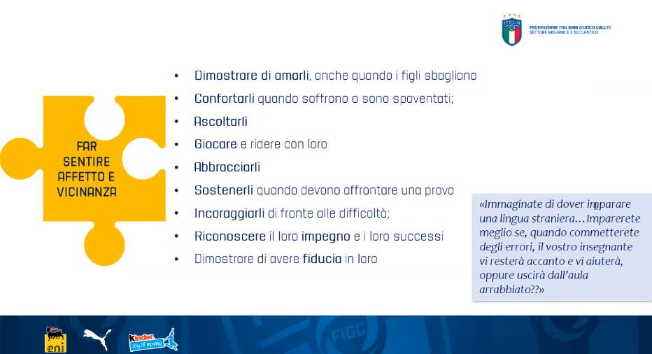 "L'obiettivo non è rendere il figlio o il giocatore perfetto ma costruire gli strumenti per sostenerli, ascoltarli, confortarli, abbracciarli, incoraggiarli, premiamo il loro impegno, dimostriamo di avere fiducia in loro ma cerchiamo sempre di mantenere il controllo".