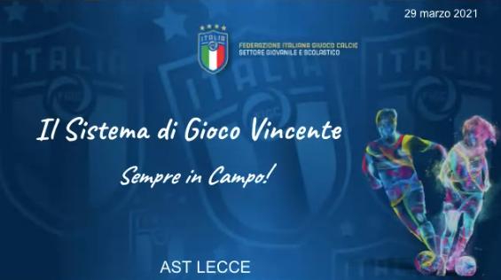 Nell'ambito del ciclo di incontri on-line utili ai fini del Programma di Informazione delle Scuole Calcio Élite, delle Scuole Calcio e dei Centri Calcistici di base, si è tenuto oggi pomeriggio, lunedì 29 marzo 2021, il primo Webinar riservato ai tecnici e organizzato dall'Area di Sviluppo territoriale di Lecce dal titolo: "Il sistema di Gioco Vincente: sempre in campo!".