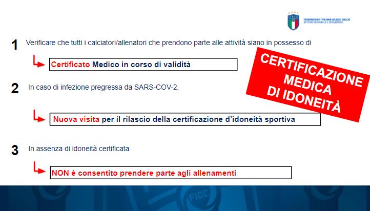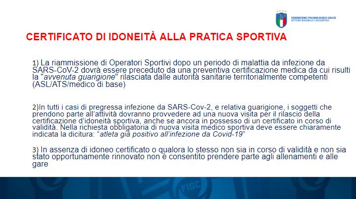Per un maggiore approfondimento dal punto di vista medico-sanitaria il Dott. Luigi Cazzetta condivide le indicazioni del Protocollo di Sicurezza da attuare prima, durante e dopo l'allenamento: "Il ruolo del medico è cambiato in seguito alla situazione epidemiologica che stiamo vivendo e poichè è in continua evoluzione dobbiamo tenere in conto di tutti gli aggiornamenti che interverranno ad innovare la materia. Le società e i ragazzi devono essere tutelati. E' obbligatoria la Certificazione Medica di idoneità sportiva in corso di validità - sottolinea - Il Debrifillatore è uno strumento di cui tutte le società calcistiche devono dotarsi prestando attenzione ad una costanza manutenzione".