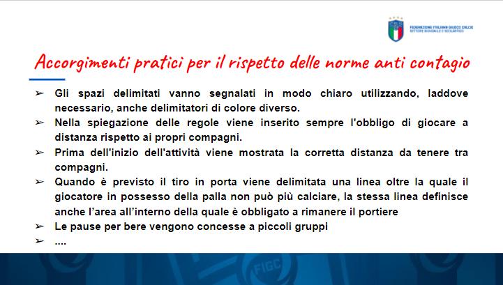 "Sul campo bisogna riprendere con entusiasmo e buone senso: è necessario aumentare la distanza e prestare attenzione alle borracce personali sempre ben pulite e sanificate. Sanificare anche i palloni, le panchine, gli spogliatoi".