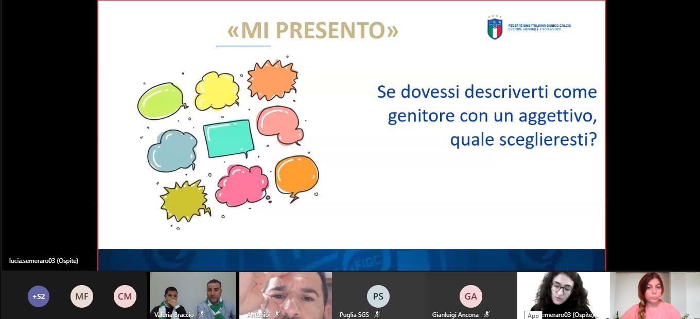 Successivamente è intervenuta la Psicologa Federale Regionale Dott.ssa Ilaria Fischetti la quale ringrazia per la presenza tutti i partecipanti, la collega Semeraro e lo staff della FIGC SGS Puglia evidenziando i diversi spunti di riflessione sul tema e aggiunge: "Il nostro scopo è quello di darvi degli input per creare progetti sempre più coinvolgenti e sfidanti. Questo ci da' la forza e l'entusiasmo di rivederci, speriamo in presenza o attraverso queste modalità alternative. Il lavoro è complesso in una situazione di emergenza - conclude Fischetti - Un ringraziamento ai tecnici delle società".