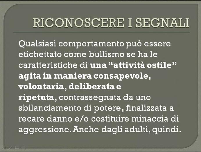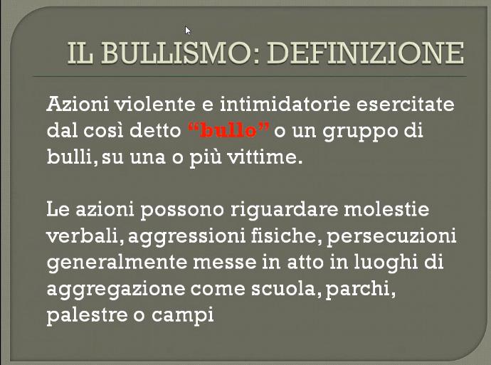 Con il supporto della visualizzazione di alcune slide la Dott.ssa Ciullo spiega il significato della parola "BULLISMO" evidenziando che "non ci sono solo comportamenti fisici ma anche verbali. Questi vengono messi di solito in atto in luoghi di aggregazione".