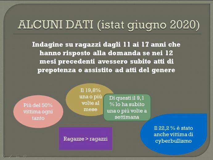 Un risultato sicuramente positivo in riferimento ad una cerchia ristretta di persone ma, purtroppo, se si fa una ricerca più ampia questo dato non è sicuramente confortante. Infatti, secondo un'indagine condotta dall'ISTAT (alcuni dati di giugno 2020) su ragazzi dagli 11 ai 17 anni più del 50% è stato ogni tanto vittima di bullismo, il 19,8% una o più volte al mese e di questi il 9.1% lo ha subito una o più volte a settimana. Il 22% è stato anche vittima di cyberbullismo. E le ragazze sono più vittime dei ragazzi.