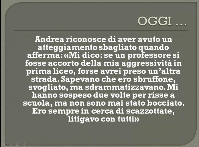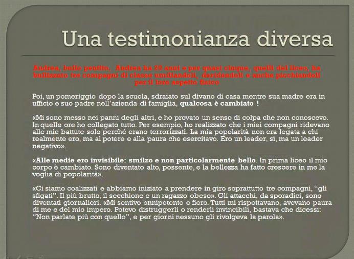 La Psicologa riporta la testimonianza di un bullo pentito sottolineando l'importanza della figura dell'adulto, del professore, che deve intervenire quando assiste ad un atto di bullismo: