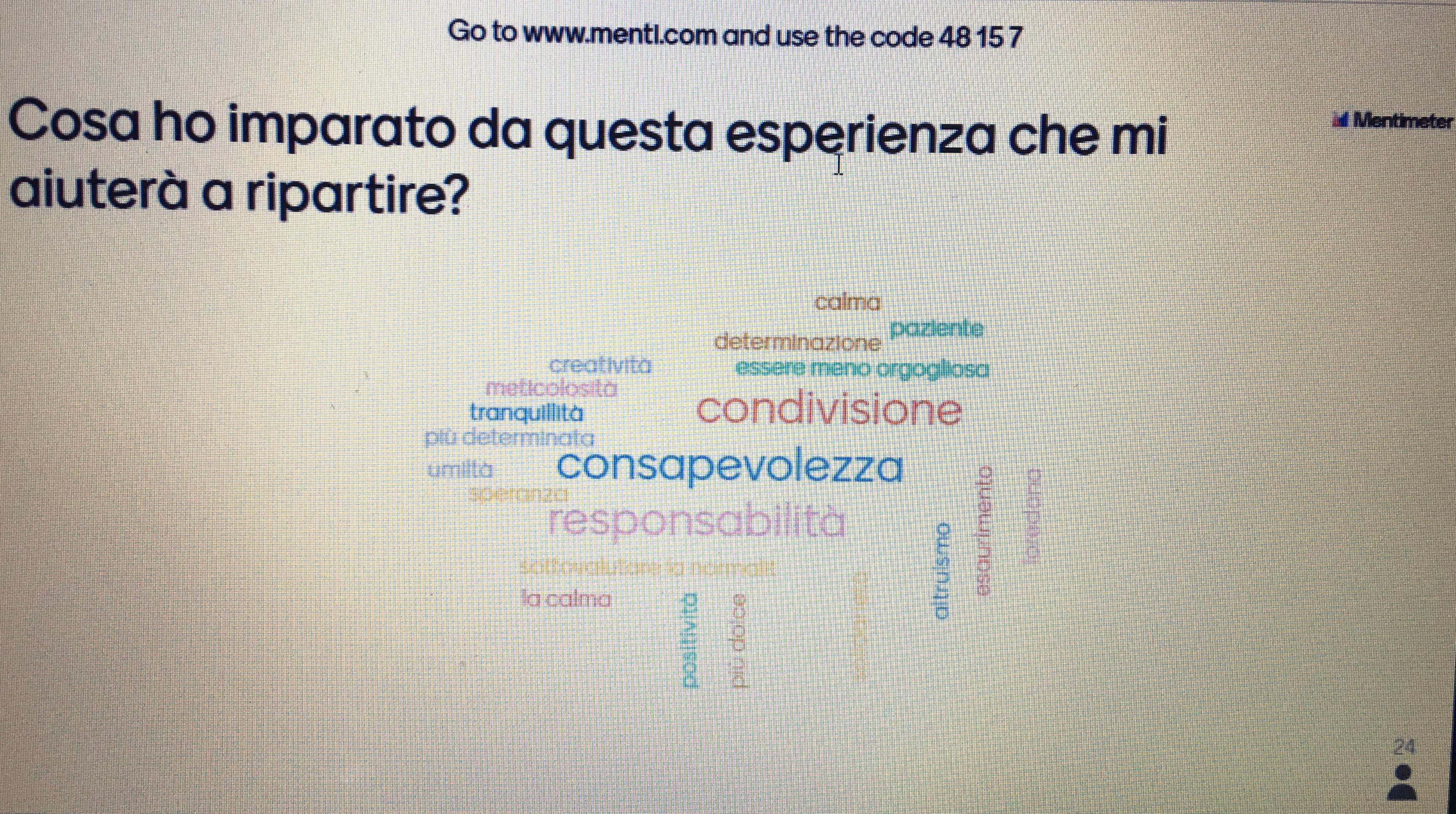 La Dott.ssa Fischetti ha proseguito con un esercitazione che ha stimolato, grazie anche ad un confronto fondamentale e positivo, gran parte dei partecipanti, i quali hanno risposto alla seguente domanda con una sola parola: "Cosa ho imparato da questa esperienza di emergenza sanitaria che mi aiuterà a ripartire?"